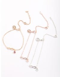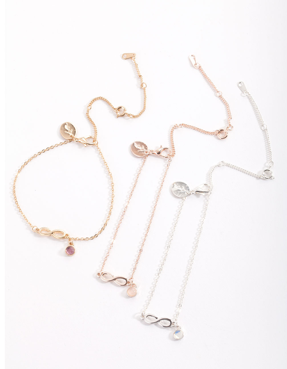 This trio of bracelets come with a infinity symbol and stone. Gold, rose gold and silver tones make up this set which is set perfect for gift-giving.