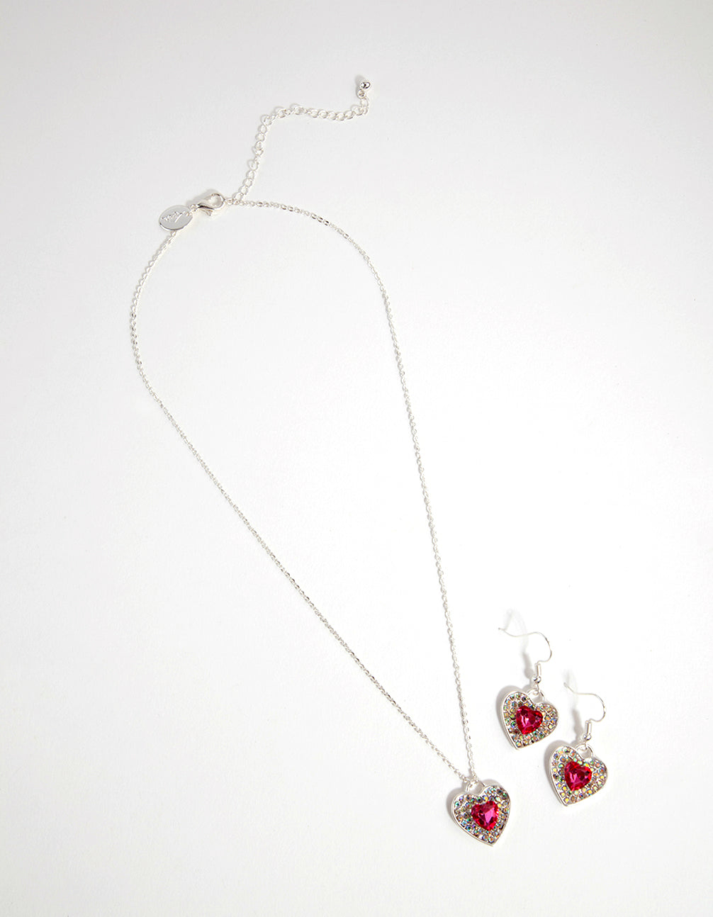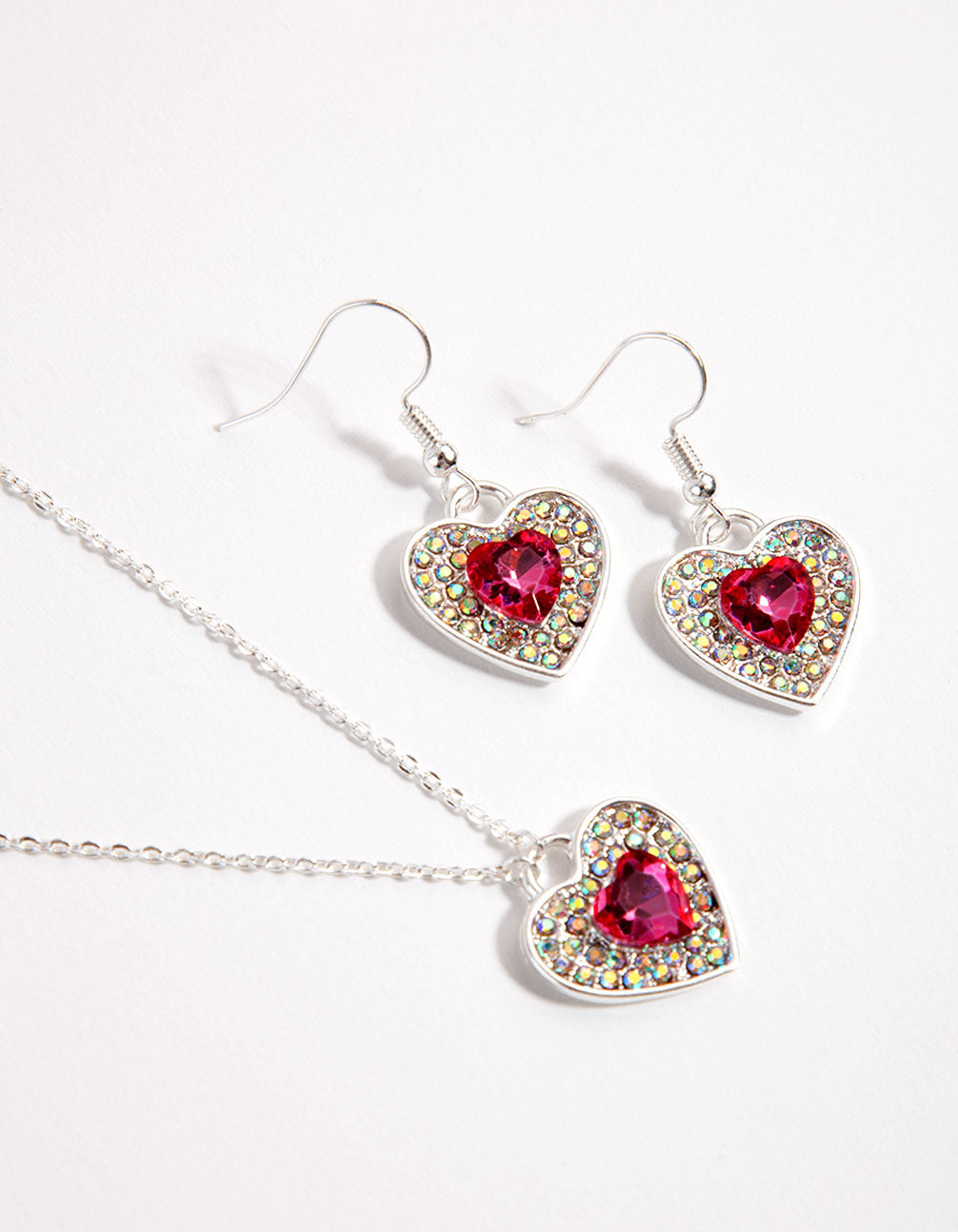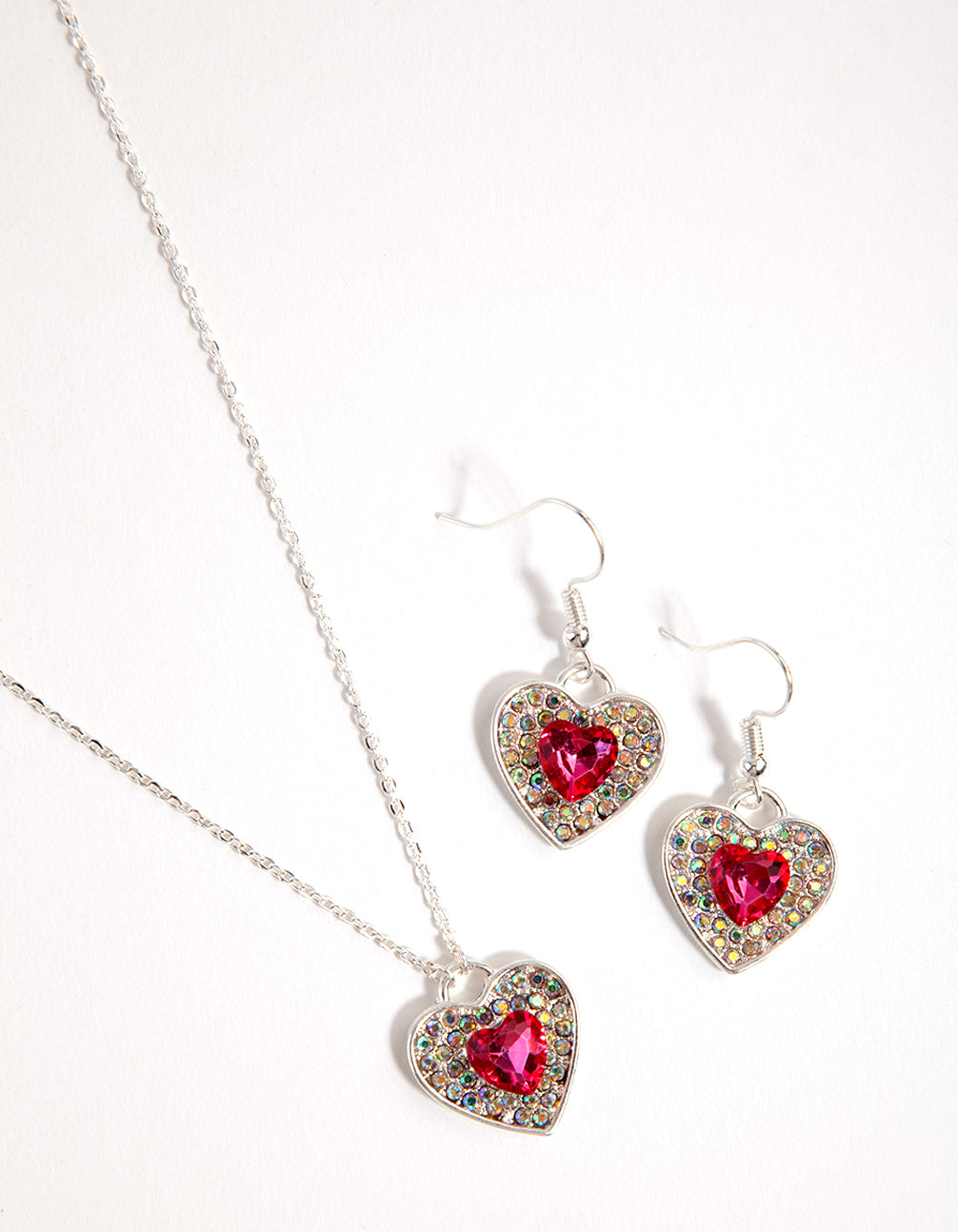You're all set! These matching silver-toned red diamante heart necklace and earrings are the perfect set. Whether it's for yourself or a gift, this set is a glamorous one-step stylish finish to any outfit.