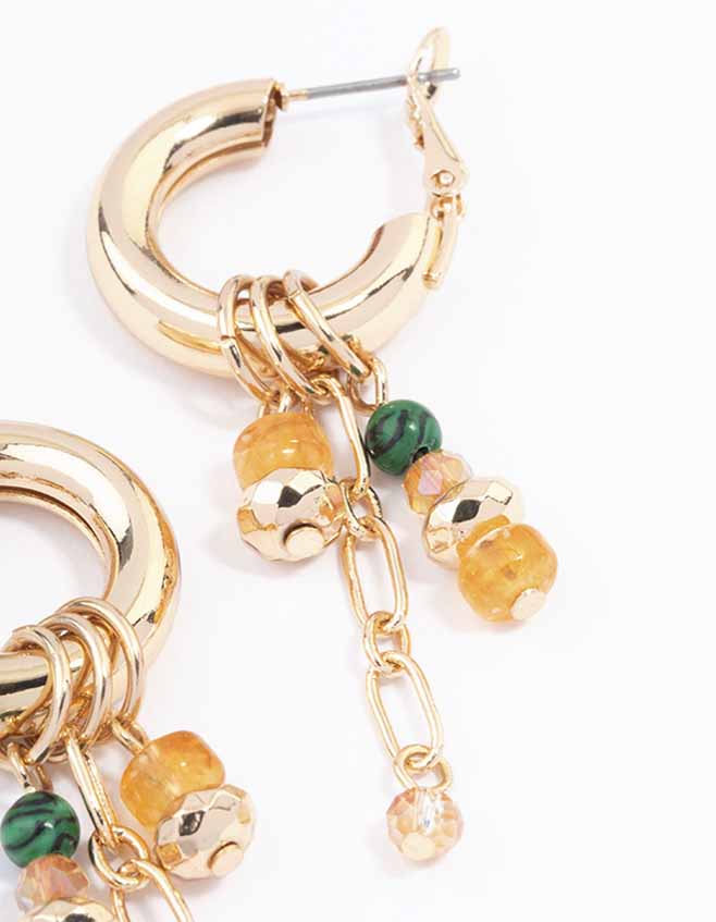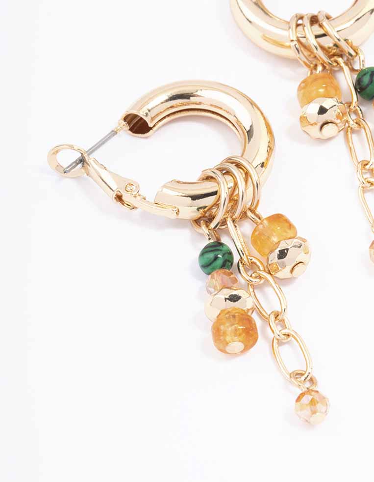 These gorgeous gold-toned hoops feature strands of orange and green beads for an eye-catching finish to your look.