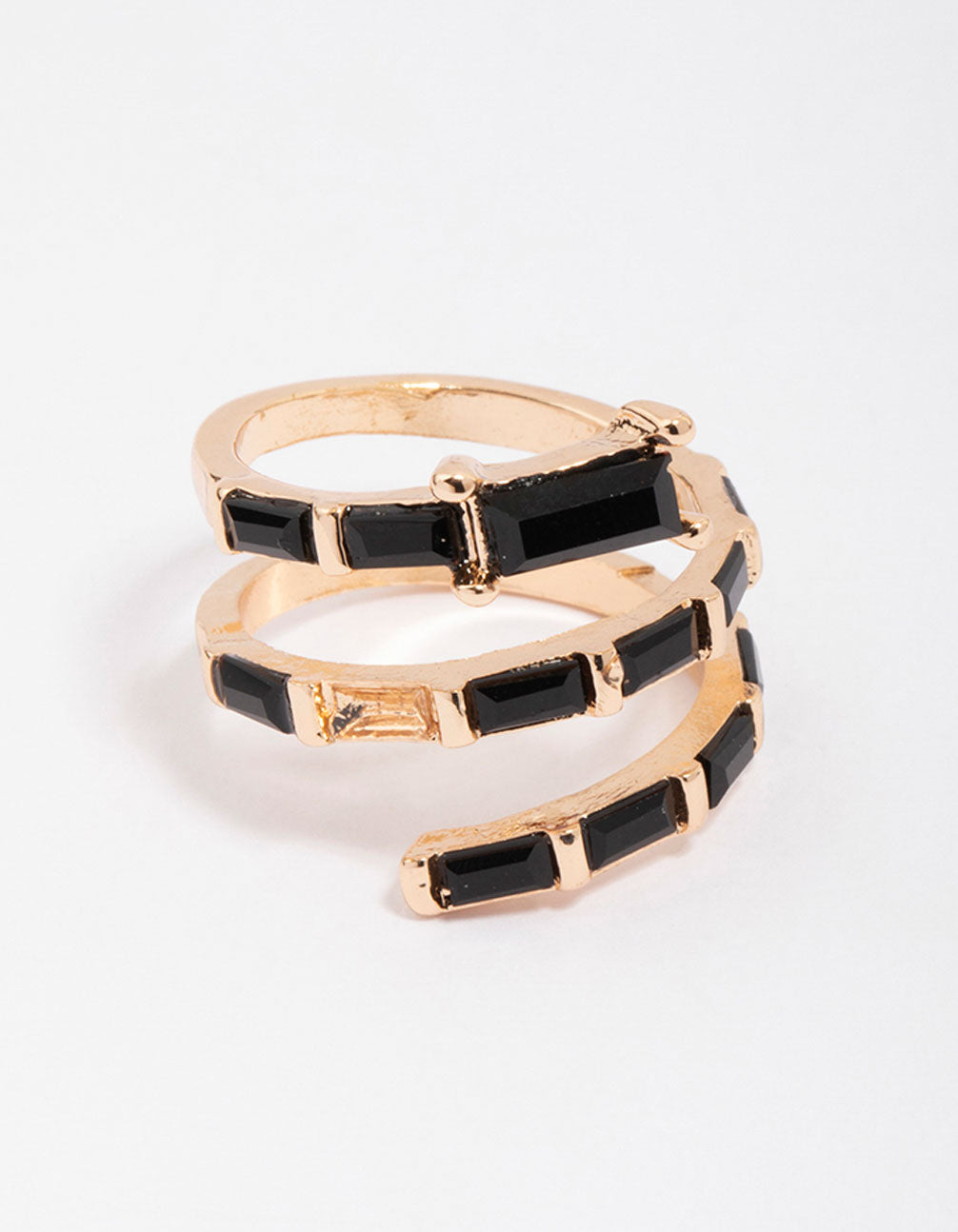 For a modern addition to your stack, style this gorgeous, gold-toned ring. This twisted statement ring features a spiral silhoutte, adorned with baguette-cut black crystals for a touch of drama.