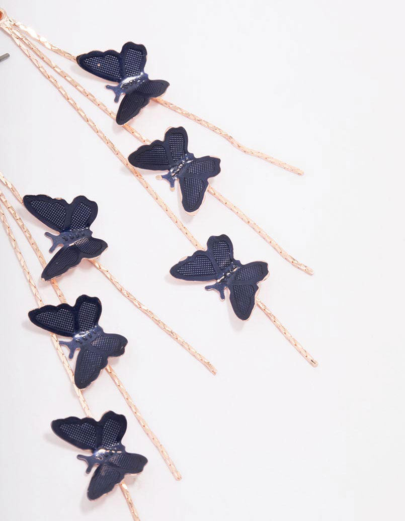 For an on-trend finish to your stack, style these unique gold drop earrings. These statement earrings feature a trio of blue butterfly motifs, perfect for adding an ethereal touch to your outfit.