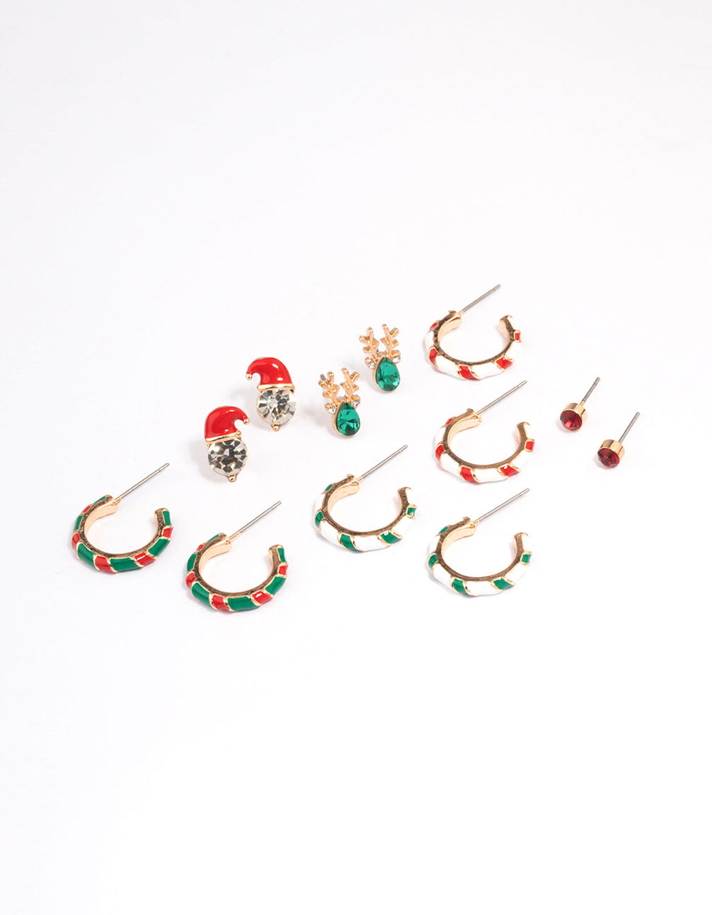 Add a playful twist to your festive outfits with this Gold Candy Cane Earrings Pack! This dazzling set is packed with seasonal charm, featuring three pairs of candy cane-inspired hoop earrings – green and red, white and green, and white and red – plus three pairs of adorable studs. You'll love the Santa hat studs with shimmering diamantes, the reindeer antler studs with a green diamante centre, and the chic red diamante studs. Perfect for parties, family gatherings, or just spreading festive vibes, these earrings are versatile enough to complement anything from cosy jumpers to dressy evening looks. Whether you're after fun novelty jewellery or statement earrings with a seasonal touch, this set is sure to make your celebrations shine!