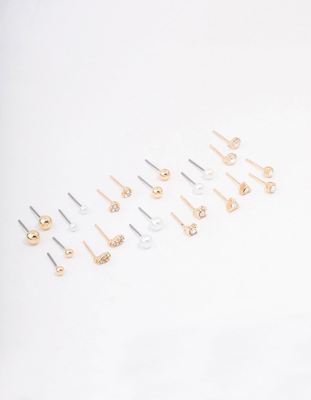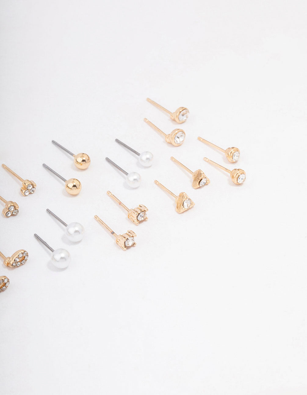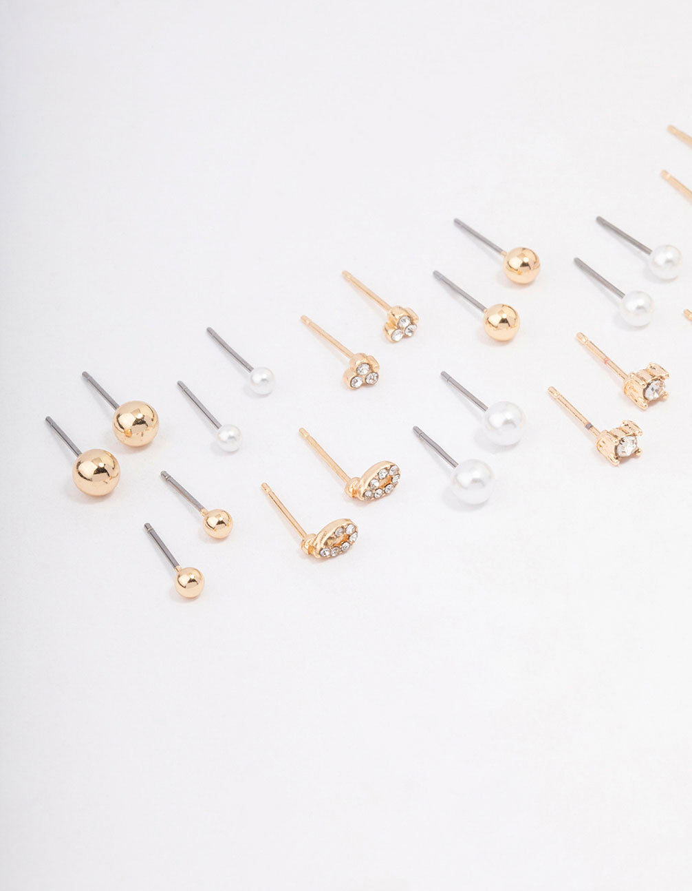 This set of twelve, gold-toned stud earrings contains a mix of pearl and diamante styles for a timeless, versatile look.