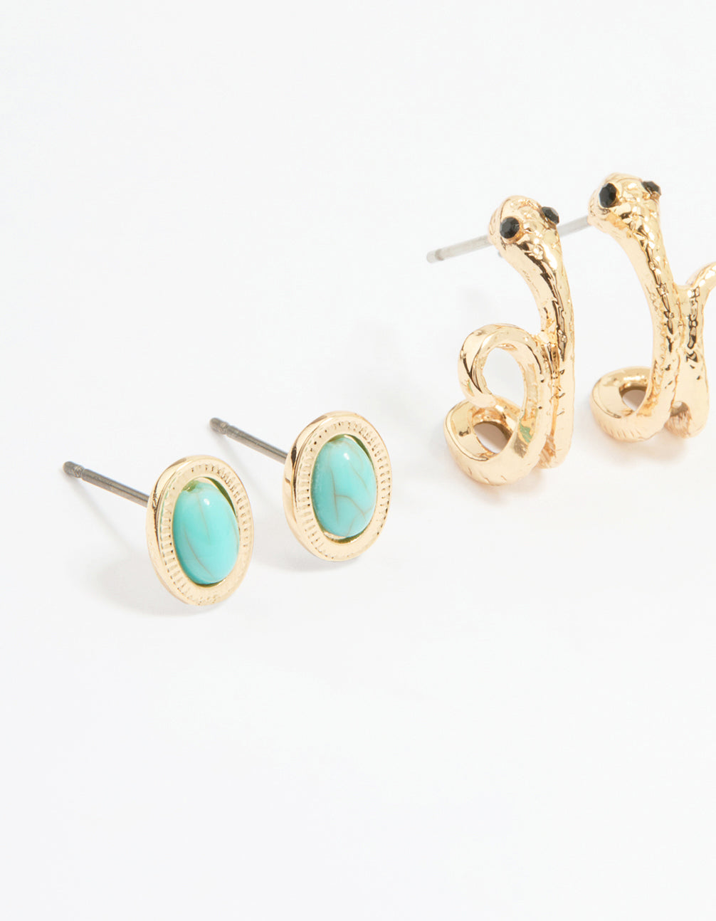 Unleash your bold side with this Gold Cross, Dagger & Snake Earrings Pack. This set features a mix of edgy and chic designs: a turquoise stud pair for a pop of colour, sleek snake studs, turquoise huggies, dagger huggies for a sharp vibe, and classic gold cross huggies for timeless charm. This earring set is perfect for mixing and matching, making them ideal for casual days or nights out. Pair them with anything from ripped jeans and a leather jacket to a flowy dress for a playful yet polished look. Whether you're layering for a curated ear or keeping it simple, this versatile set has something for every mood.