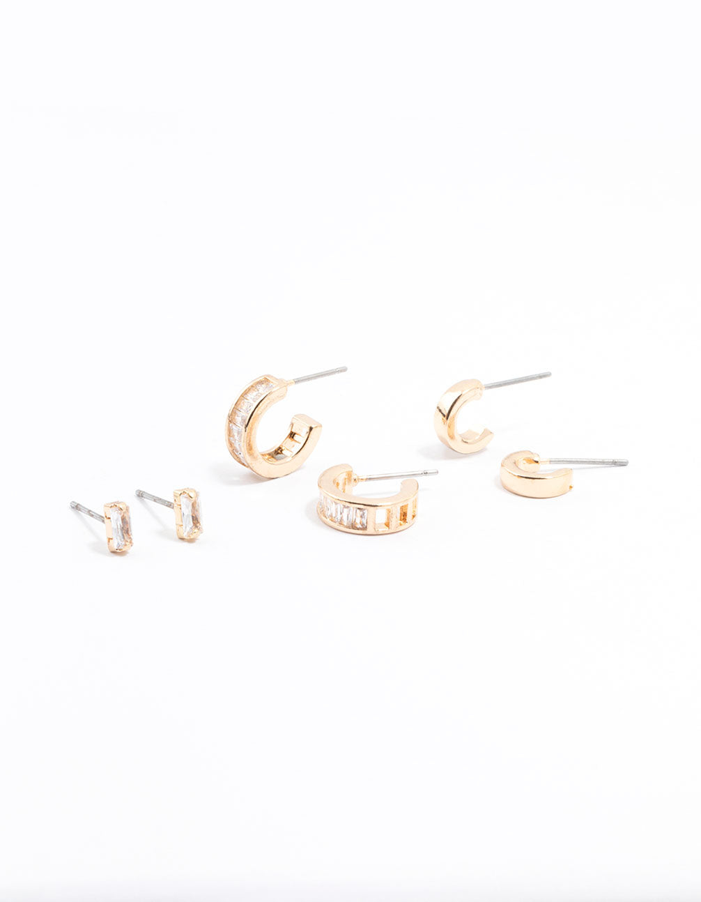 This charming set includes three earrings: glittery cubic zirconia hoop studs, plain luxe gold hoops, and rectangular cubic zirconia studs. Mix and match for endless styling possibilities.