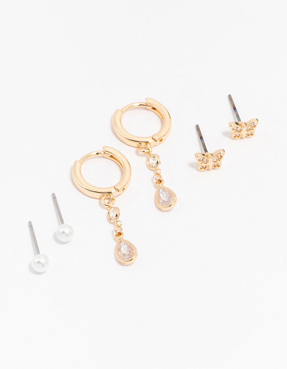 Gold Cubic Zirconia Pearl & Butterfly Mixed Earring 3-Pack
