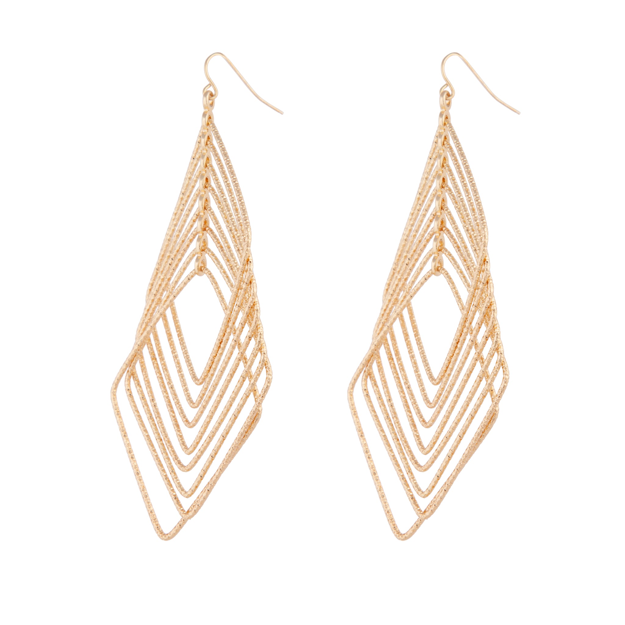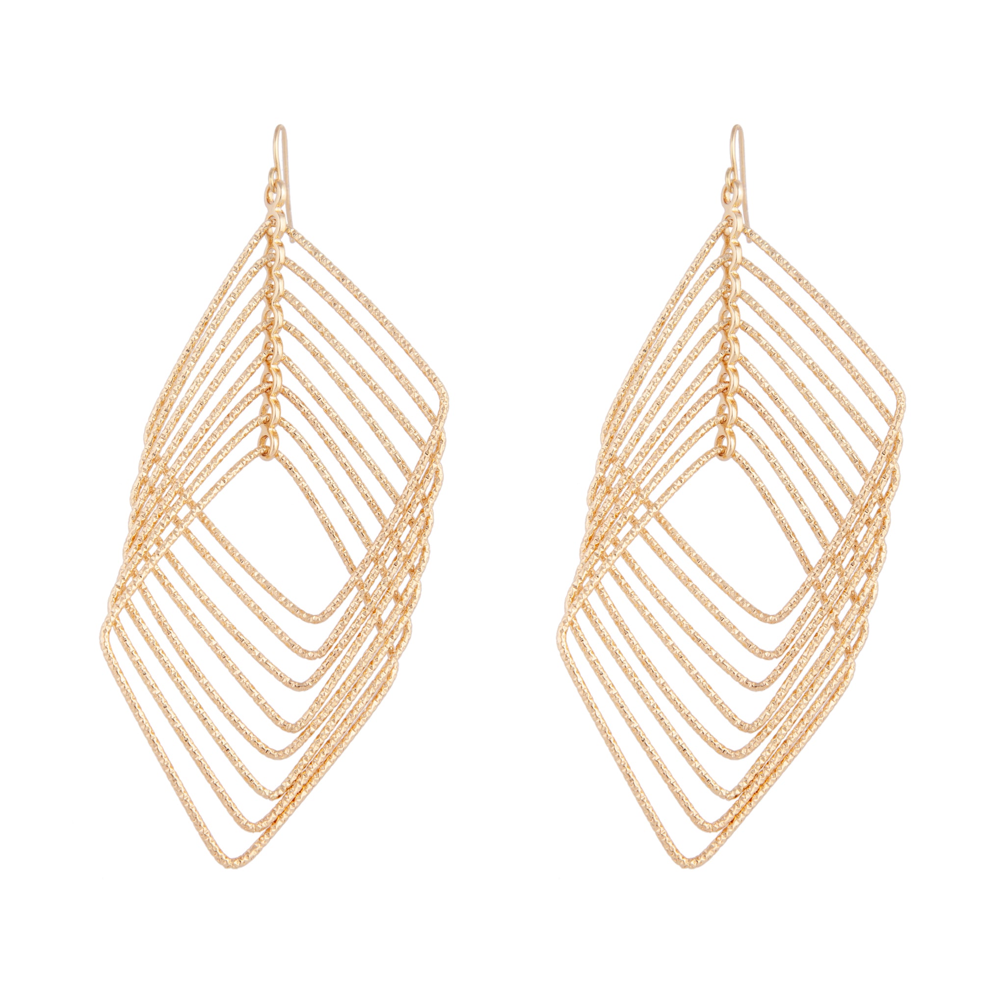 A pair of large gold-toned earrings in a textured diamond design.