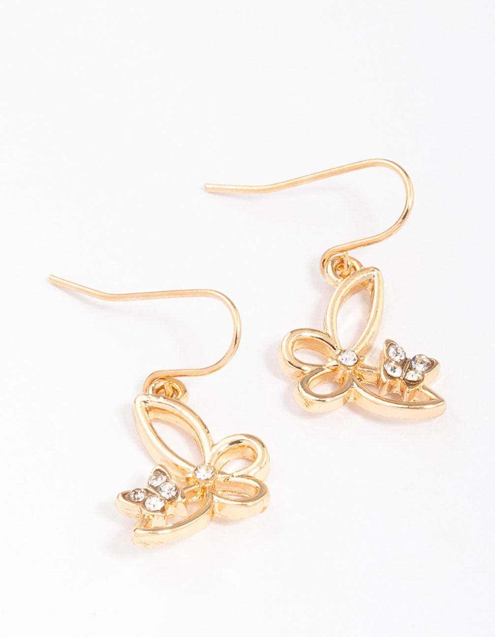 Add a touch of elegance and whimsy to your outfit with these Gold Diamante Cut Butterfly Drop Earrings. Crafted with a delicate butterfly design and a sparkling diamante cut finish, these gold-toned drop earrings are perfect for elevating any look. With their French hook backing, they're super easy to wear, whether you're dressing up for a night out or adding a playful twist to your daytime ensemble. Pair them with a floaty dress for a boho vibe, or style them with a sleek jumpsuit for a modern edge. These dainty earrings are a must-have for any jewellery lover looking to add a bit of sparkle and charm to their collection.