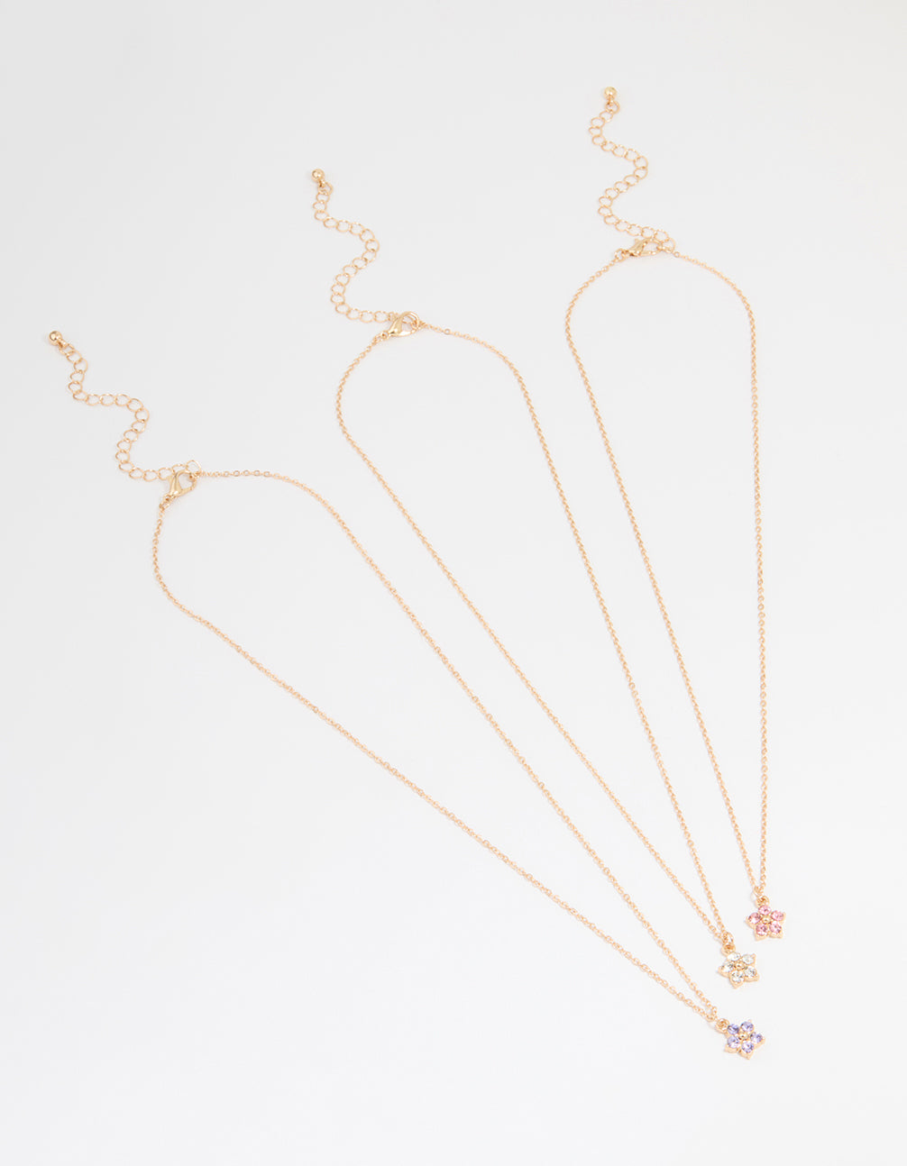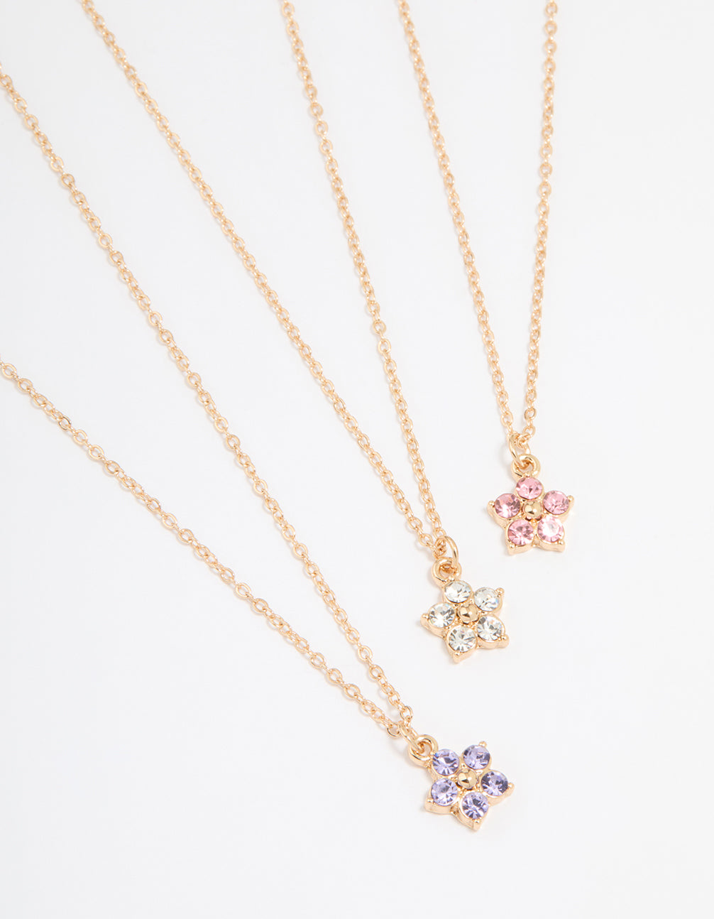 Add a pop of colour and shimmer to your jewellery collection with this Gold Diamante Flower Necklaces Pack. This set includes three delicate necklaces, each featuring a diamante flower pendant in pink, clear, and purple hues. The dainty gold-toned chains are perfect for layering or wearing solo, giving you endless styling options. Ideal for dressing up casual outfits or adding a touch of elegance to evening looks, these necklaces are versatile and effortlessly chic. Whether paired with a flowy dress or your favourite jeans and tee combo, they're a great way to elevate your vibe. Perfect for gifting, this set is a thoughtful surprise for someone special—or a lovely treat for yourself!