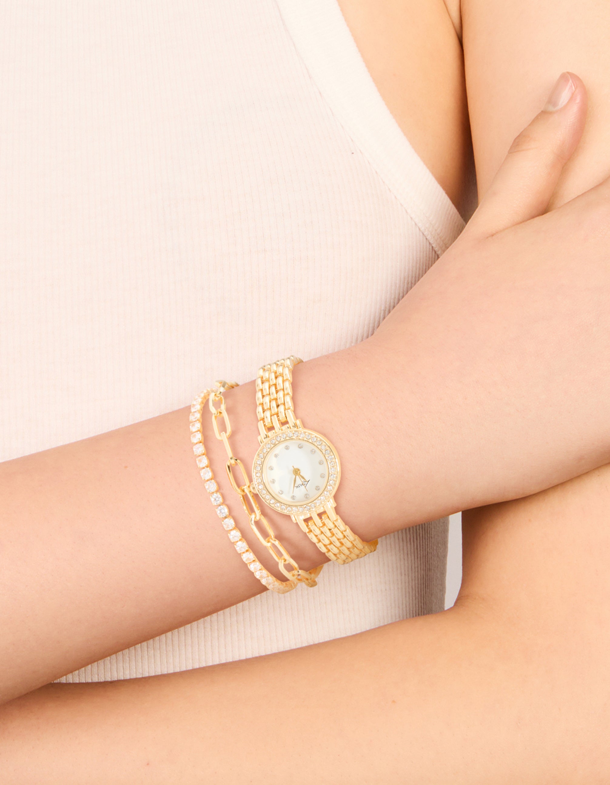 This Gold Diamante Watch & Bracelets Set is the ultimate gift for jewellery lovers and style enthusiasts. Perfect for gifting, this set includes a chic thick classic watch with a shimmering diamante watch face, a sleek cubic zirconia tennis bracelet, and a plain link chain bracelet. Ideal for bracelet stackers, your recipient can mix and match for any look. Whether dressing up for a special occasion or adding a touch of glamour to everyday outfits, this set is versatile and timeless. Pair it with a flowy dress for a polished vibe or keep it casual with jeans and a crisp shirt. A thoughtful gift that blends elegance and practicality, this set makes accessorising effortless and stylish!