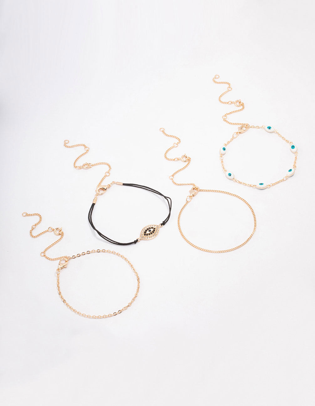Style this set of four gold evil eye bracelet and anklets for a curated finish to your stack.