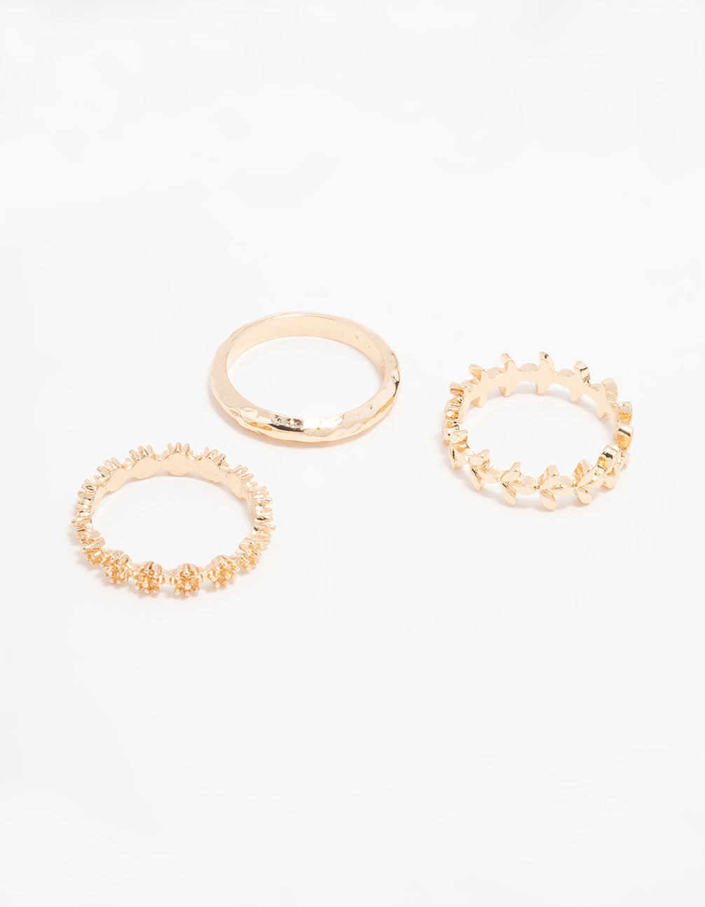 Upgrade your ring game with this stunning gold-toned trio! Featuring a vine design, a flower design, and a textured finish, they're perfect for a chic, stylish look.