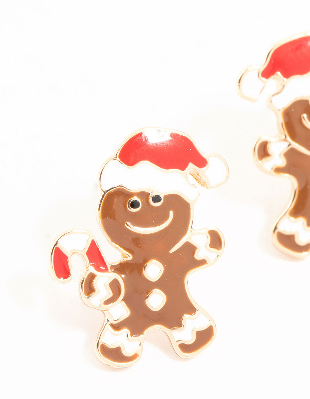 Gold Gingerbread Man With Candy Canes Stud Earrings