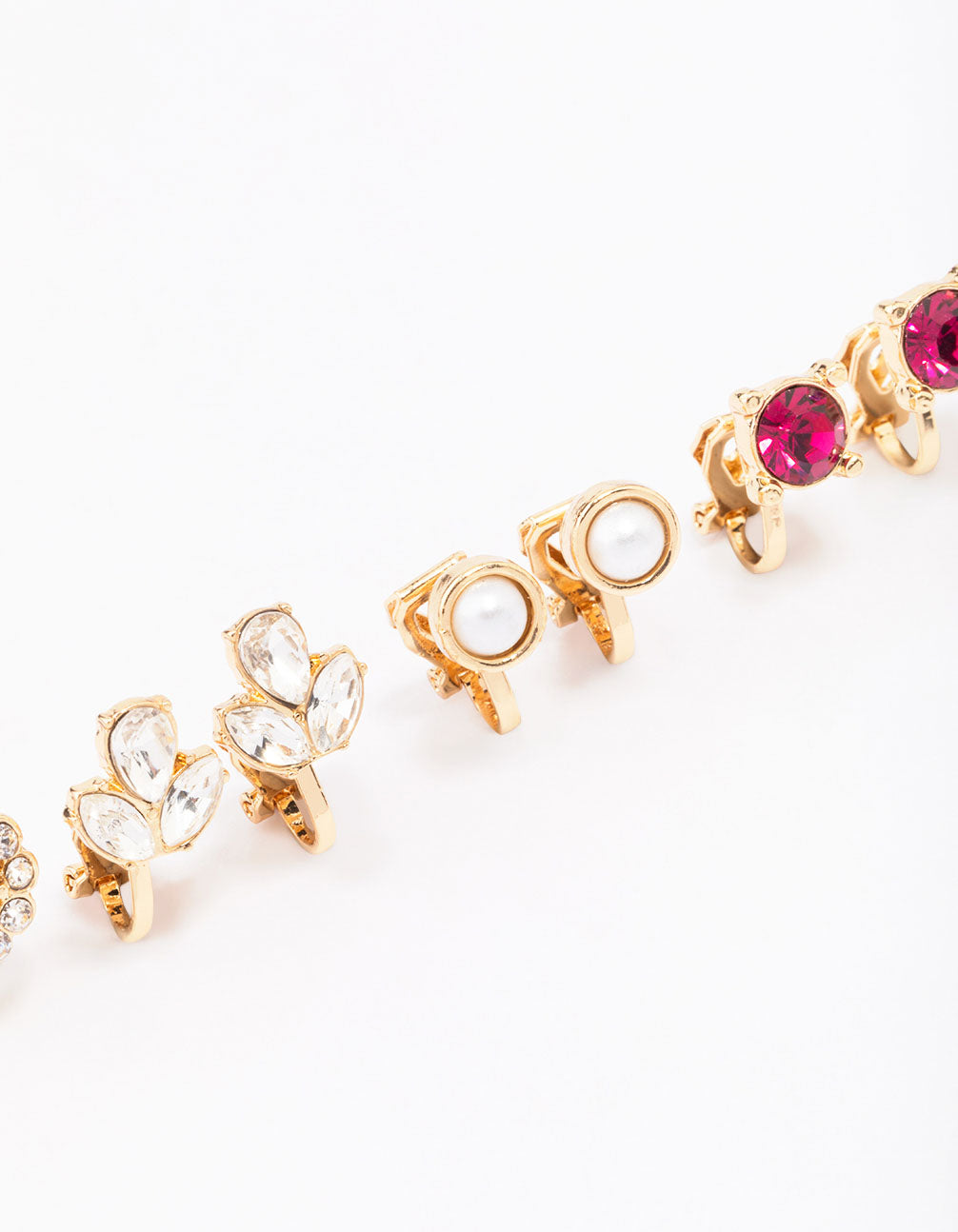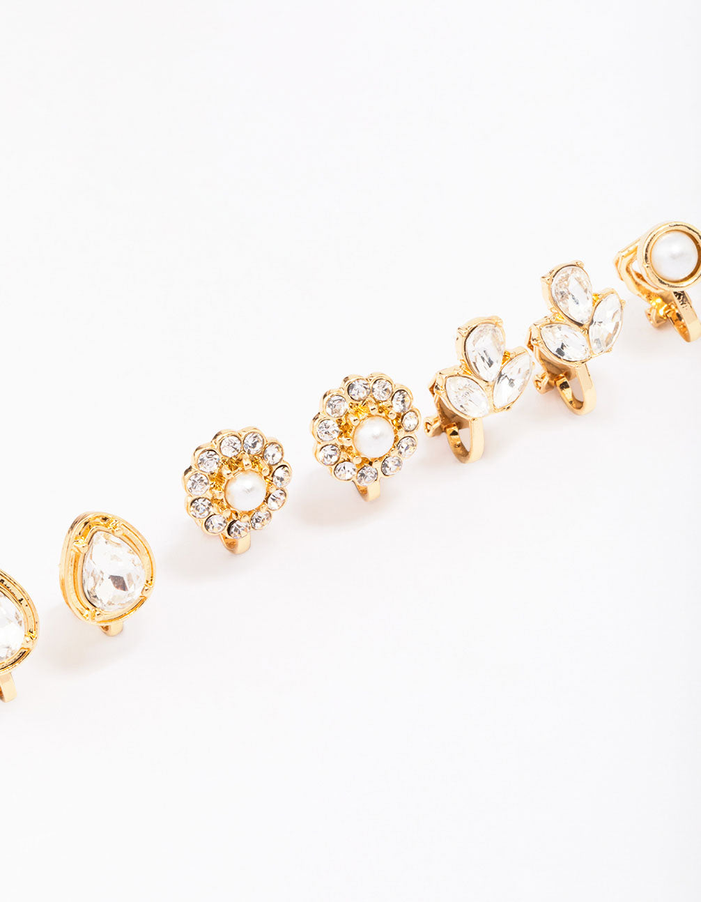 Create the ear stack of your dreams with this pack of gold-toned earrings. This earring pack includes five sets of clip on earrings, each adorned with their own embellishments and motifs. Perfect for styling together, or solo!