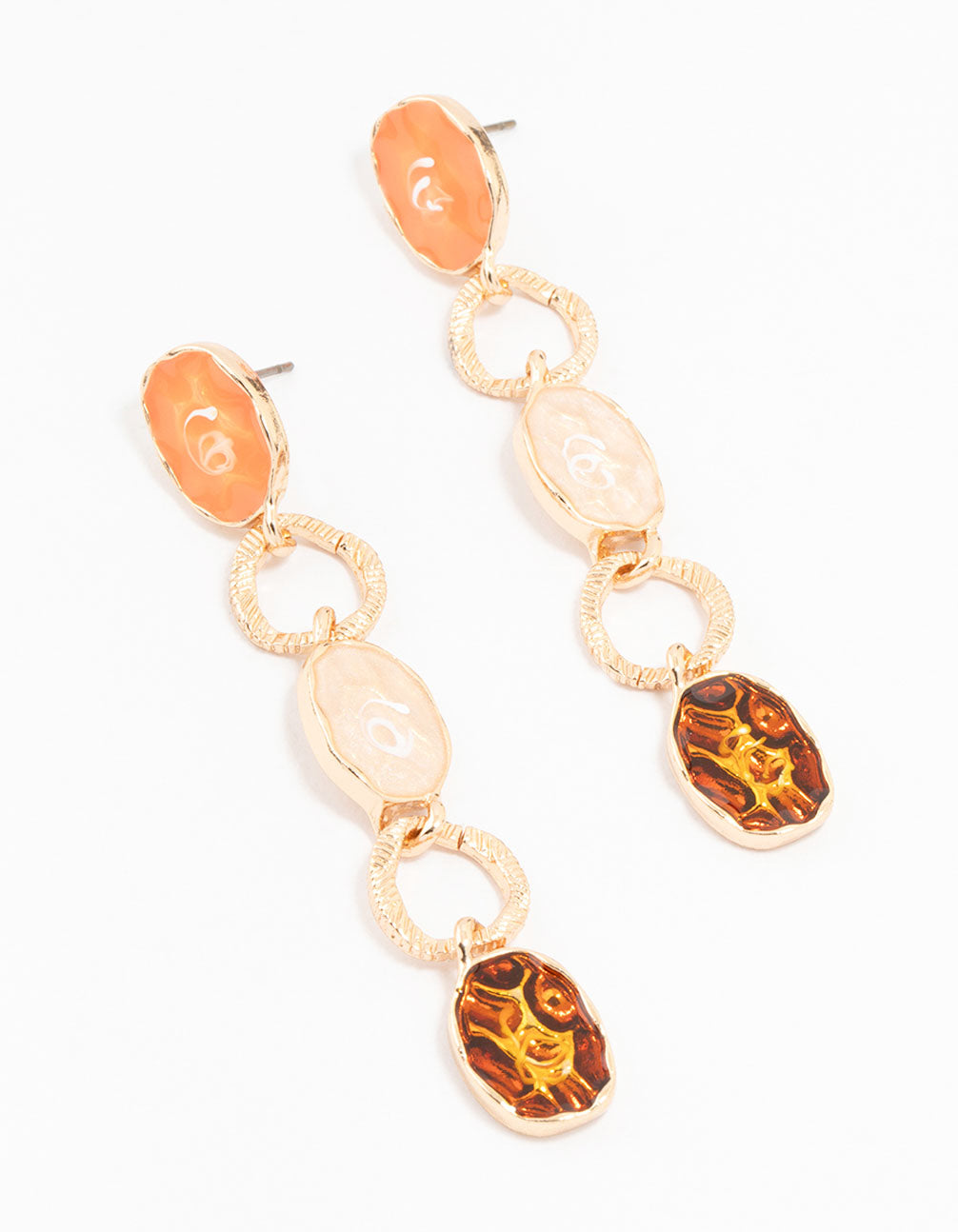 These elegant drop earrings feature a chain of mixed charms in a gold finish, dangling from link posts for a stylish and versatile look. The charms add subtle movement and shine, making this pair perfect for both daytime and evening wear.