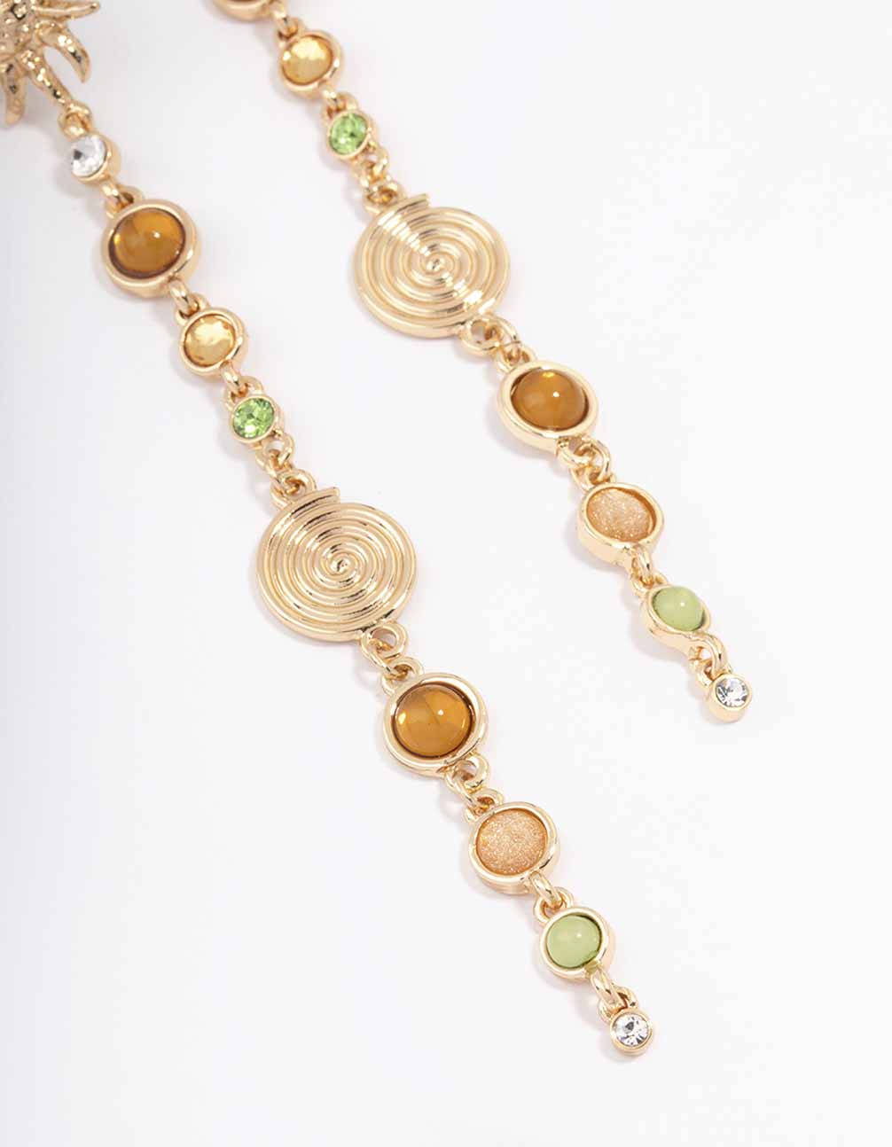 These stunning drop earrings feature a collection of amber and green gemstones, adorned with sun motifs for a bright finish to your look.