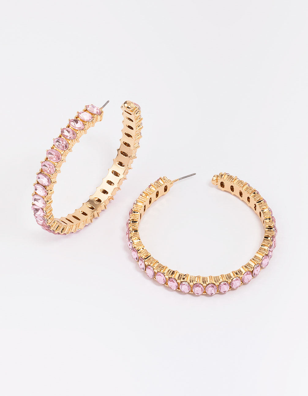 For a captivating addition to your stack, style these gorgeous gold-toned hoops. These hoop earrings feature a large silhouette, encrusted with round pink-coloured diamantes for a pop of colour.