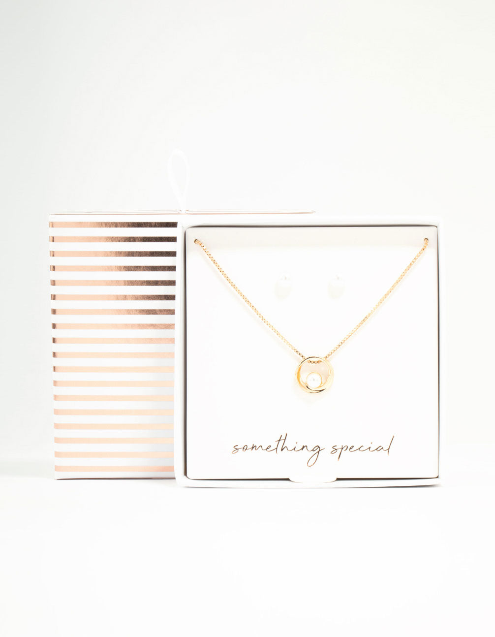 Surprise someone special with this stunning jewellery set. This set includes an open circle and pearl necklace, and matching pearl stud earrings. It's perfect for anyone who appreciates a chic look.