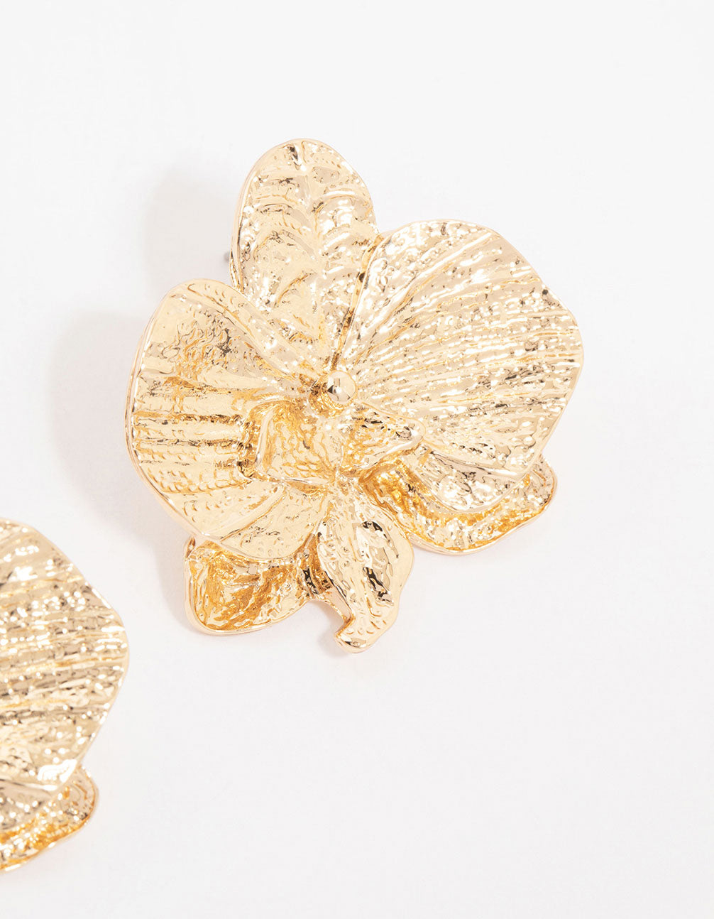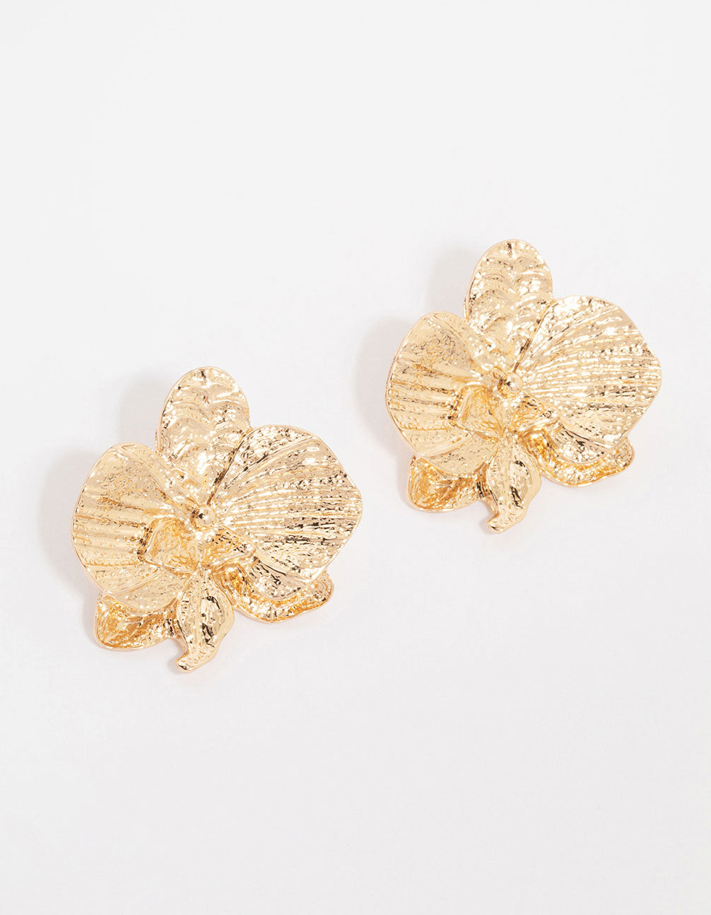 Add a touch of floral flair with these gold-toned stud earrings! Featuring a chic orchid flower design, they're perfect for a fabulous look.