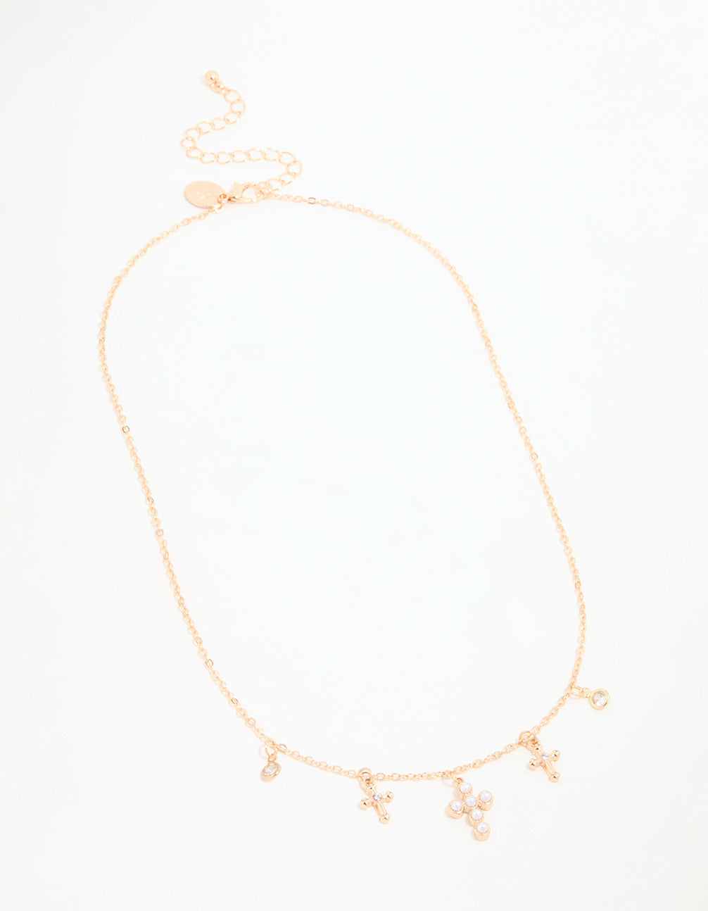 Add elegance to your jewellery collection with this Gold Pearl Diamante Cross Charm Necklace. This chain necklace features delicate gold tones, elegant pearl accents, diamantes and cross charms. This charm necklace is perfect for layering with other necklaces or wearing solo as a standout piece. Whether you're dressing up for a special occasion or adding a little glamour to your everyday outfits, this versatile necklace pairs beautifully with anything from flowy dresses to casual denim. A timeless yet stylish accessory, it's the perfect finishing touch for any look!