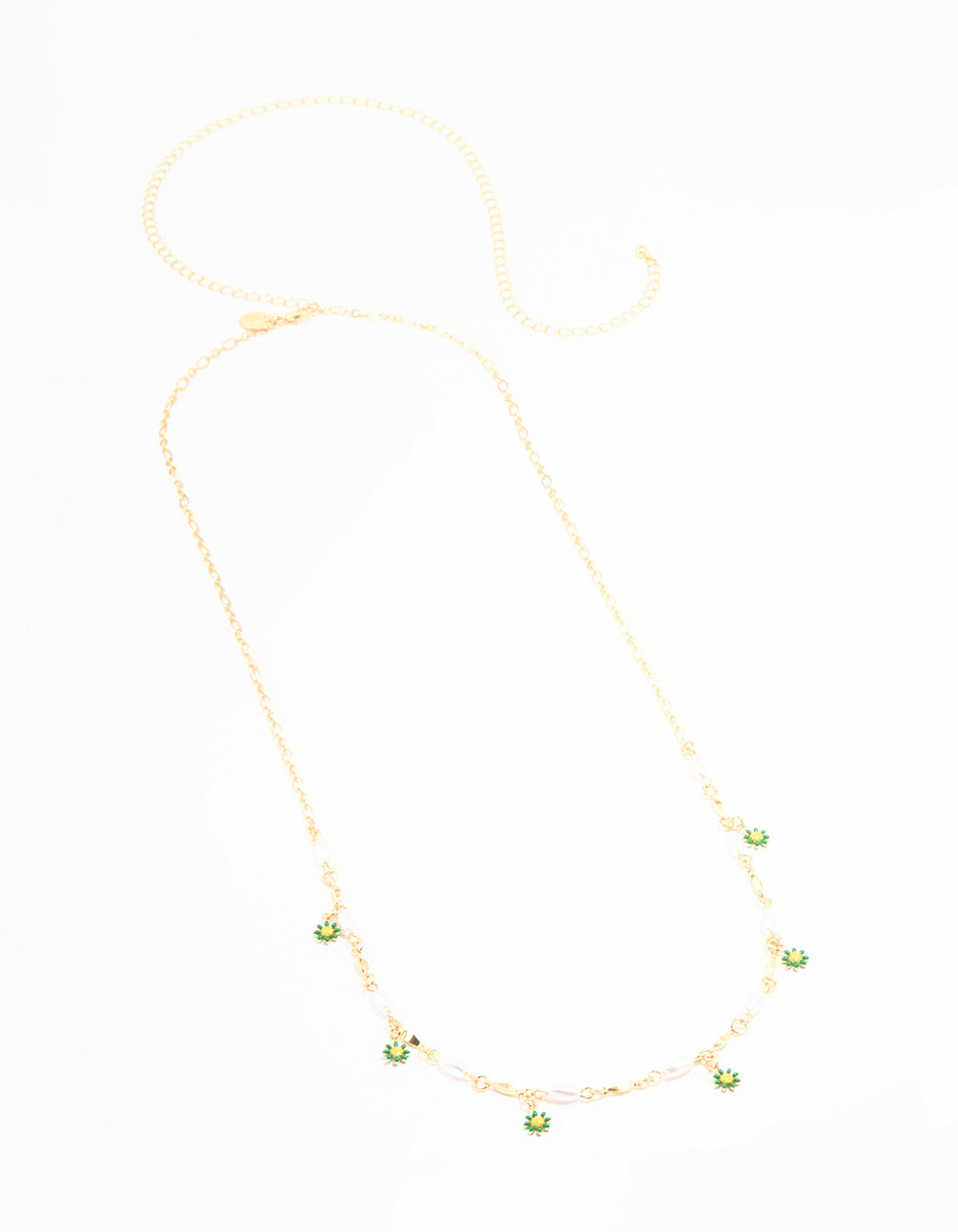 Add a fresh, floral twist to your style with this Gold Pearl & Green Flowers Waist Chain. This stunning chain combines delicate gold tones with charming green flower accents and lustrous pearls for a look that's both playful and elegant. Perfect for festivals, beach days, or summer parties, this waist chain is the ultimate accessory to elevate your outfit. Layer it over a flowy maxi dress for a boho-chic vibe or pair it with high-waisted shorts and a crop top for casual glam. Lightweight and versatile, this waist chain is your go-to for adding a unique touch to your wardrobe.