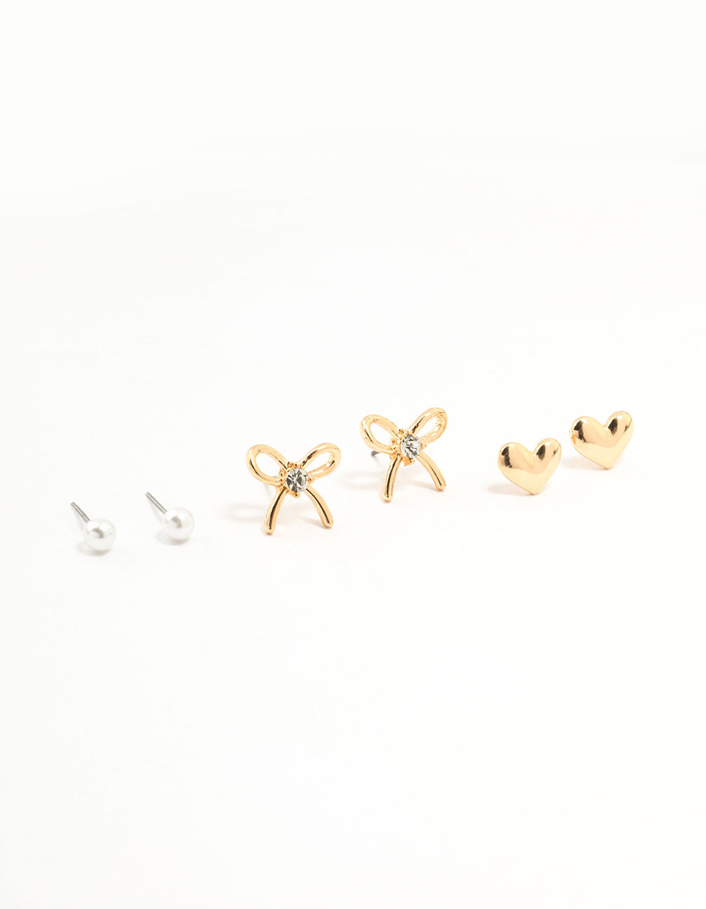 Elevate your look with this 3-pack of chic gold-toned heart-shaped bow earrings accented with lustrous pearls. This sophisticated studs are perfect for any ensemble, from a casual brunch to a night out on the town.