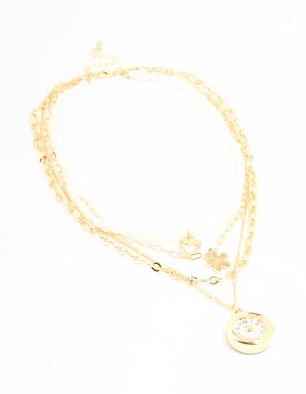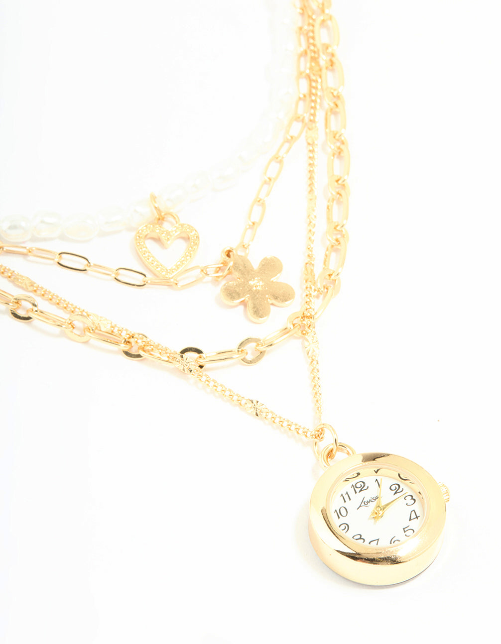 Make every moment shine with this Gold Pearl Watch & Flower Layered Necklace. This necklace combines the elegance of layered jewellery with functional flair—a delicate pearl with a heart pendant layer, a charming flower outline layer, and a unique watch pendant. Crafted with gold plating, it's a perfect blend of style and practicality. Ideal for adding a touch of sophistication to casual outfits or complementing dressier looks, this necklace is your go-to accessory for anything from brunch dates to evening parties. Pair it with a chic blouse, flowing dress, or even a tailored blazer for effortless elegance. This versatile necklace is not just jewellery—it's a statement piece that keeps you stylishly on time!