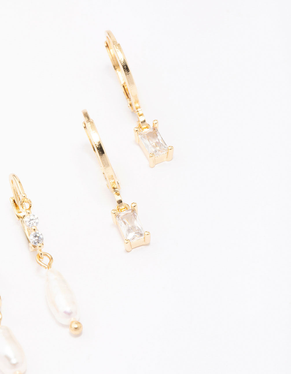 Add a refined touch to your stack with these gold plated drop earrings. This earring pack includes two pairs of gold drops, adorned with baguette-cut crystals and freshwater pearls for a luxe finish.