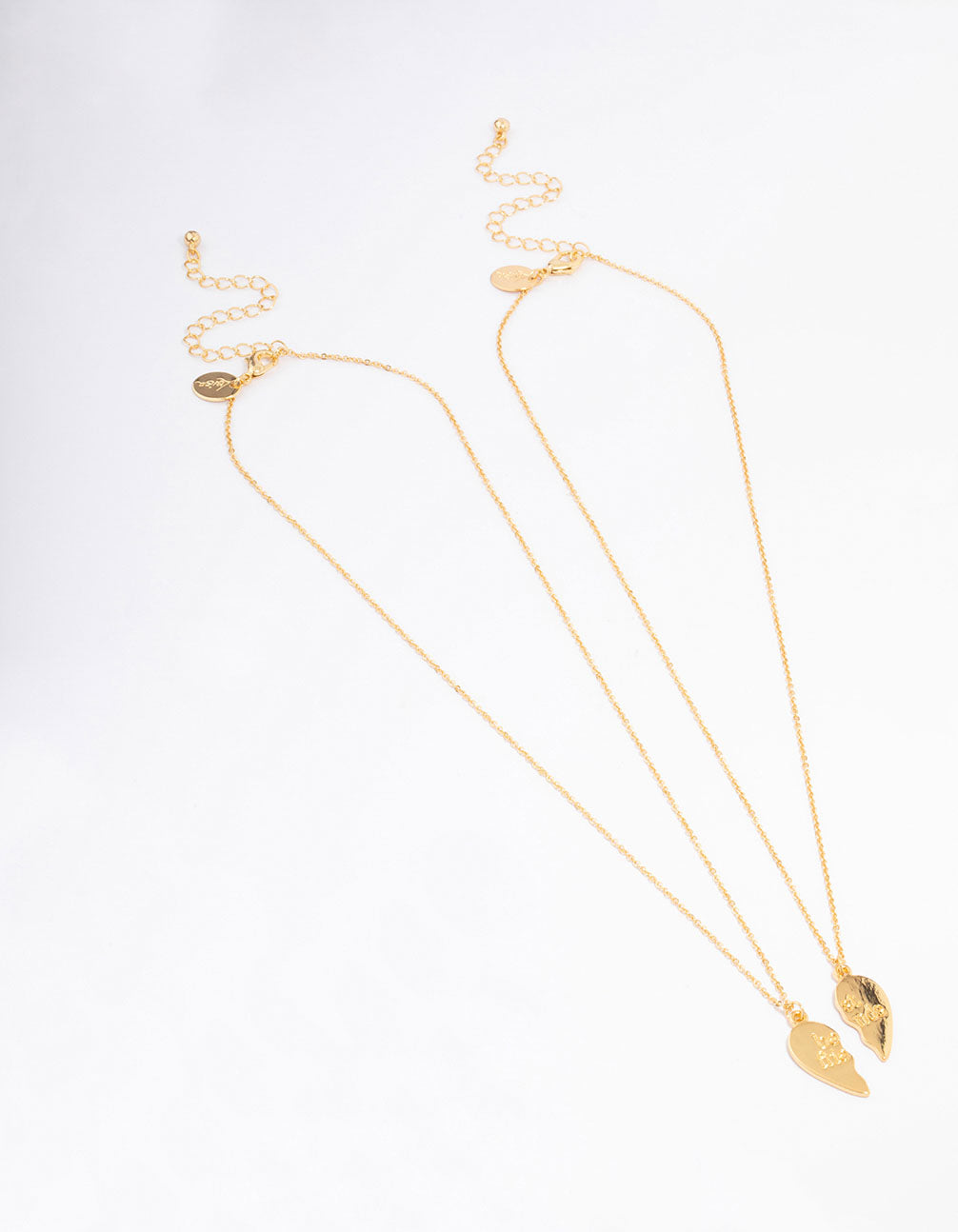 This set contains two, genuine gold plated pendant necklace with two halves of heart. Each half is etched with the words 'best friends.'