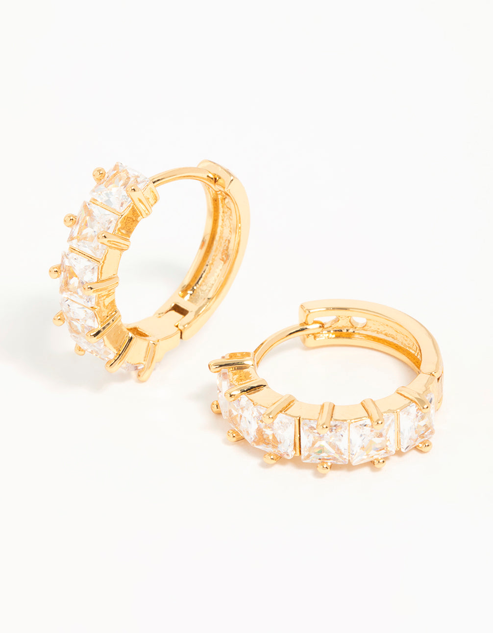 Gold Plated Brass Cubic Zirconia Baguette Medium Huggie Earrings