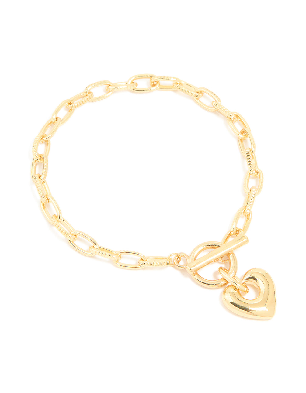 Add a touch of charm to your look with this Gold Plated Brass Heart FOB Chain Bracelet! Featuring a bold chain design paired with a delicate heart-shaped design and fob chain detailing, this bracelet is the perfect mix of sweet and statement-making. Whether you're dressing up for a dinner date or adding flair to your casual jeans-and-sneakers outfit, this piece can do it all. Style it solo for a sleek, minimalist vibe, or stack it with other gold-toned bracelets to create a layered look that's totally Insta-worthy. Pair it with a flowy dress for a romantic feel, or let it peek out from under your blazer sleeves for a polished, modern edge. Ideal for day-to-night outfits, this bracelet is your new favorite accessory for mixing and matching with ease!