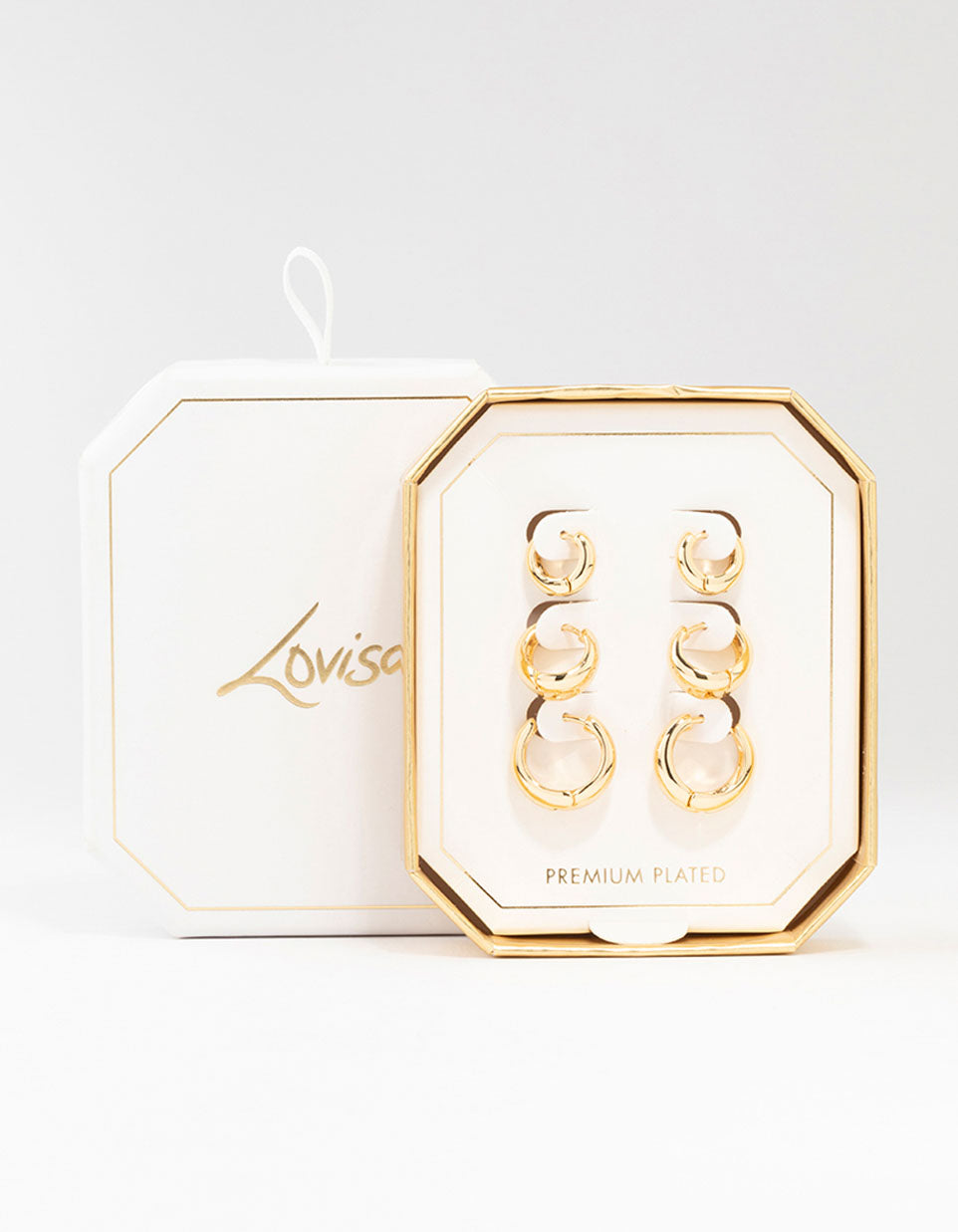 Give the gift of IT girl style essentials with this set featuring three luxe gold plated hoop earrings ideal for elevating any wardrobe. Perfect for loved ones who appreciate a minimalist aesthetic.