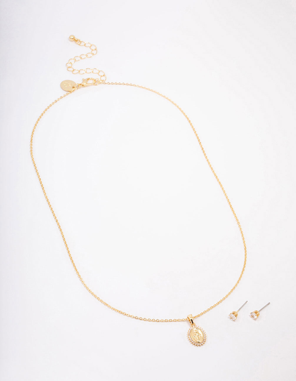 Gold Plated Crystal Coin Pendant Necklace & Stud Earring Set