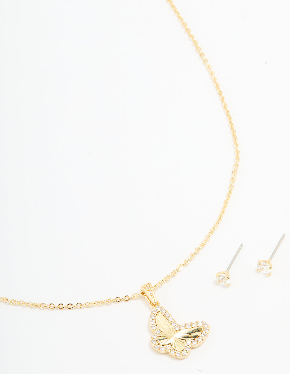Gold Plated Cubic Zirconia Butterfly Necklace & Stud Earrings Set