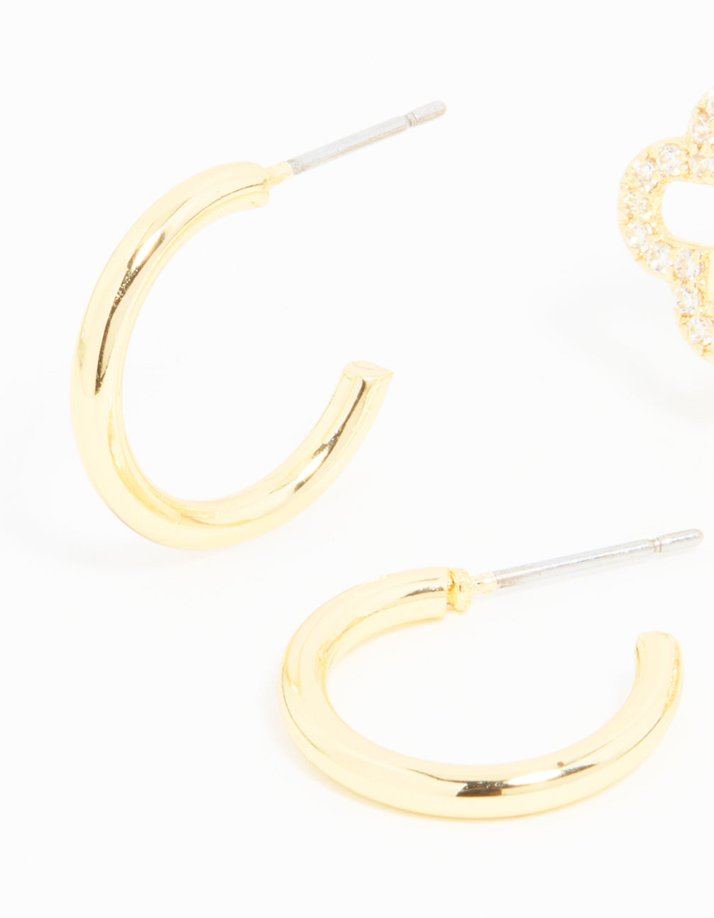 Gold Plated Cubic Zirconia Flower & Plain Huggie Earrings 2-Pack