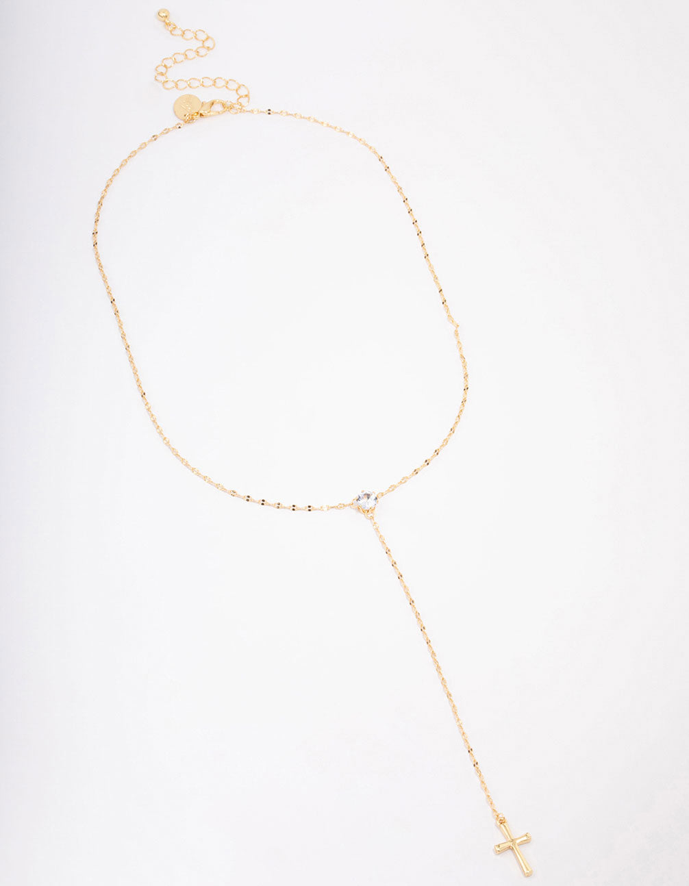 Gold Plated Cubic Zirconia Cross Lariat Necklace