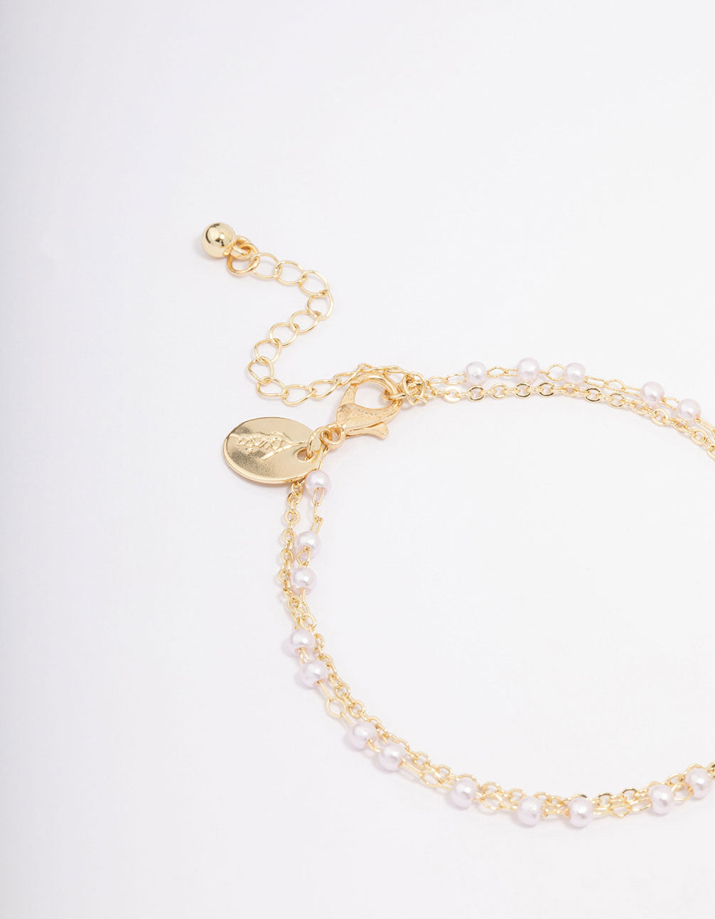Add detail and interest to your stack with this gold plated bracelet. This layered bracelet features a dainty gold chain, adorned with a simple cross motif, layered with a string of pearls. Perfect for adding impact to your stack!