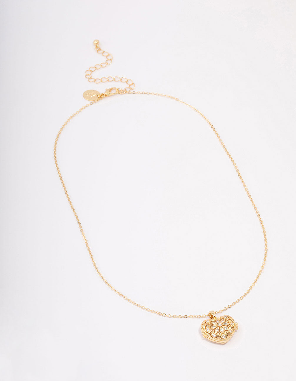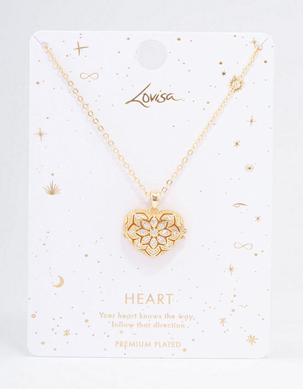 This pendant is plated with real gold and features an ornate, heart charm decorated with delicate diamantes for a touch of sparkle.