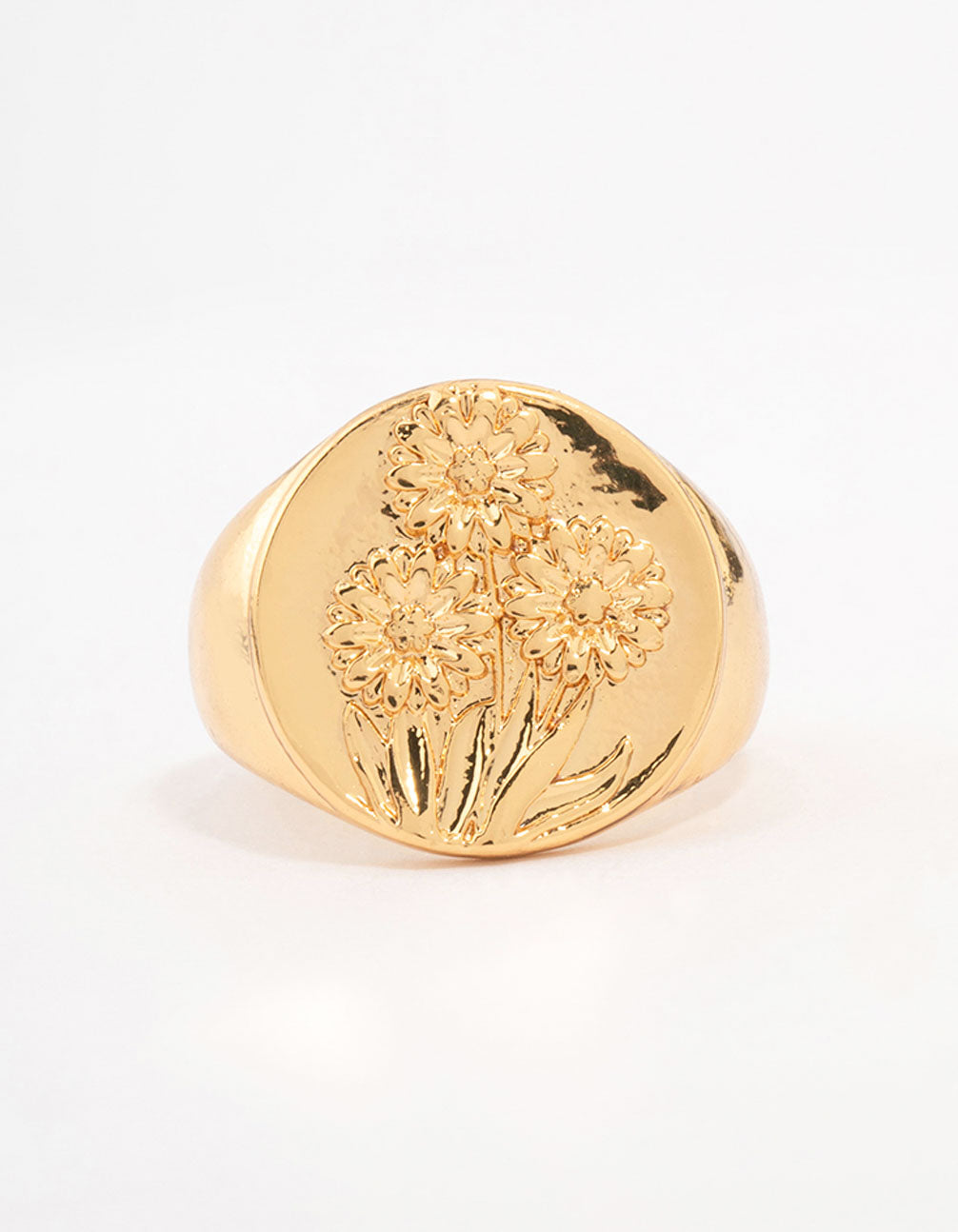 This timeless ring is plated with gold and features a bold, signet ring design etched with delicate sunflowers.