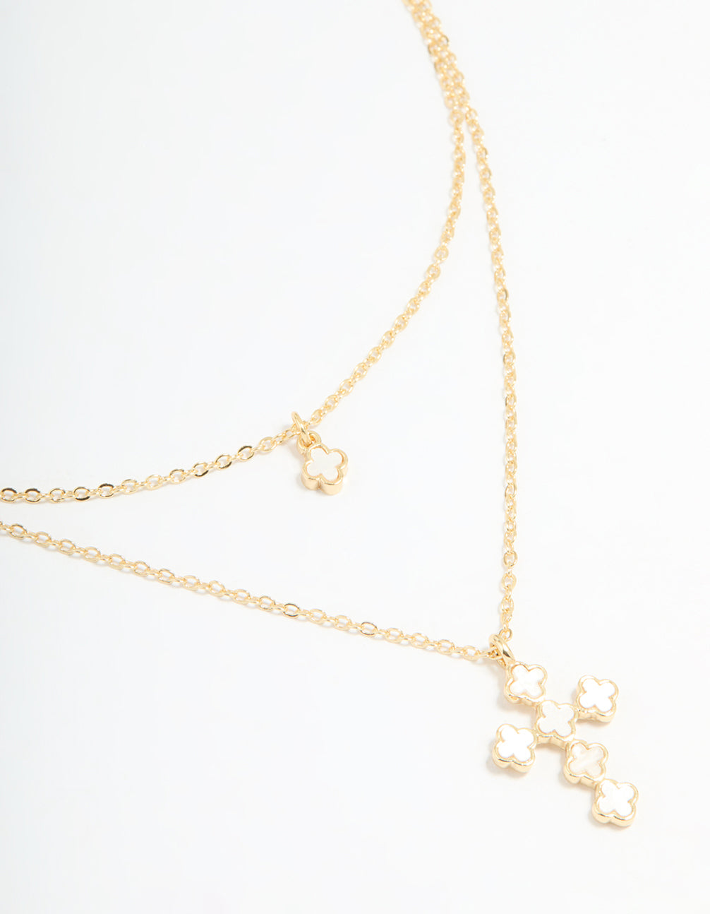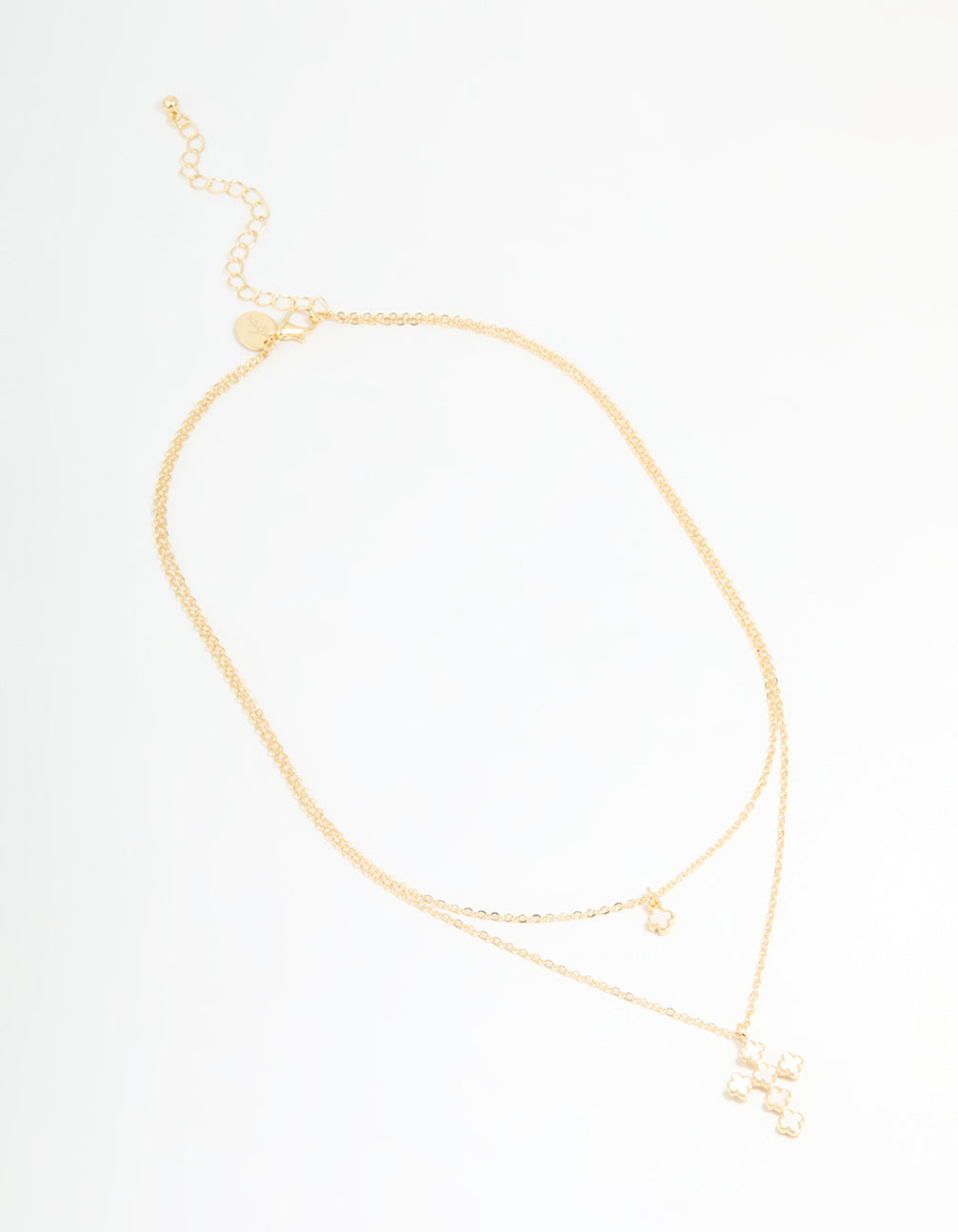Elevate your look with this Gold Plated Flower & Cross Layered Necklace. Featuring a layered style, this necklace showcases a dainty cross and floral accents, both finished in luxurious gold plating. Perfect for adding dimension to any outfit, it's great for layering over casual tees or complementing a flowy dress. Ideal for daytime outings or evening events, this piece combines elegance with versatility, making it a go-to accessory. Whether you're dressing for brunch or a romantic dinner, this layered necklace is a stylish way to express your individuality while keeping your jewellery game effortless and chic.