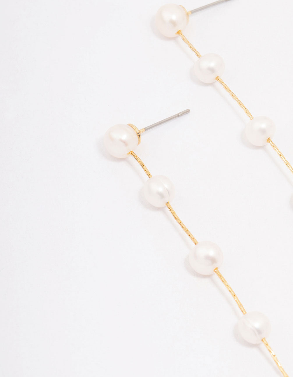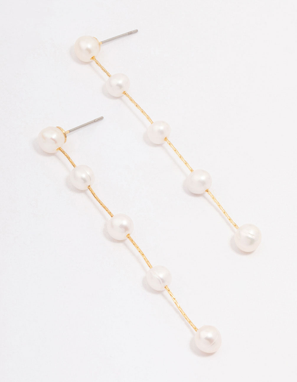 For a sleek addition to your stack, style these gold plated drop earrings. These long earrings feature a fine gold strand, adorned with five freshwater pearls for a dotted look.
