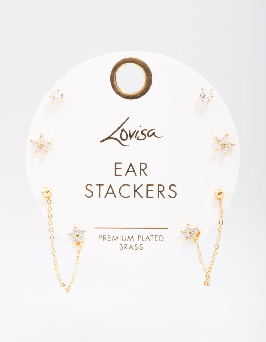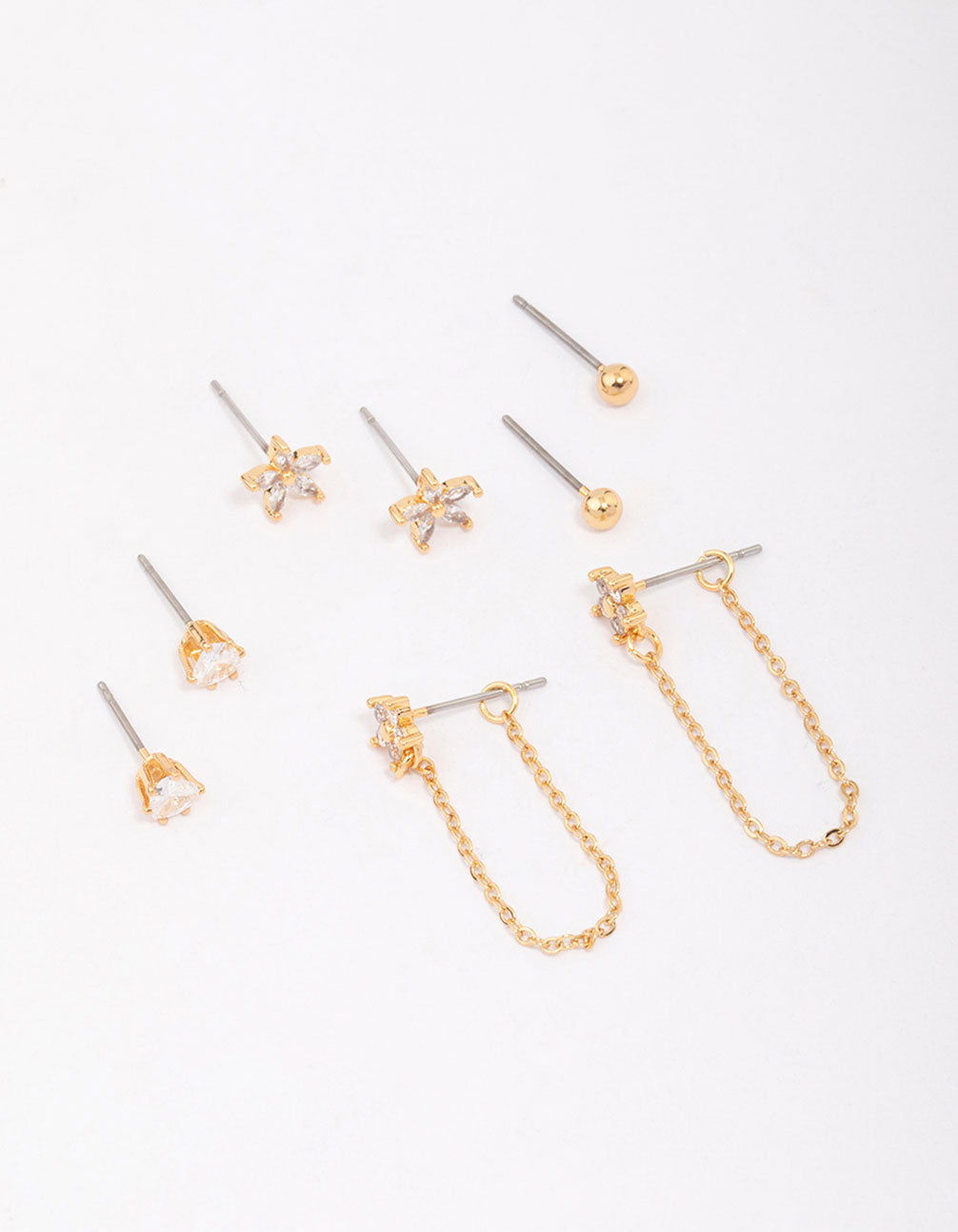 For a decorative addition to your look, style these gold plated brass earrings. This earring pack includes four pairs of stud and chain earrings, perfect for styling together or solo!