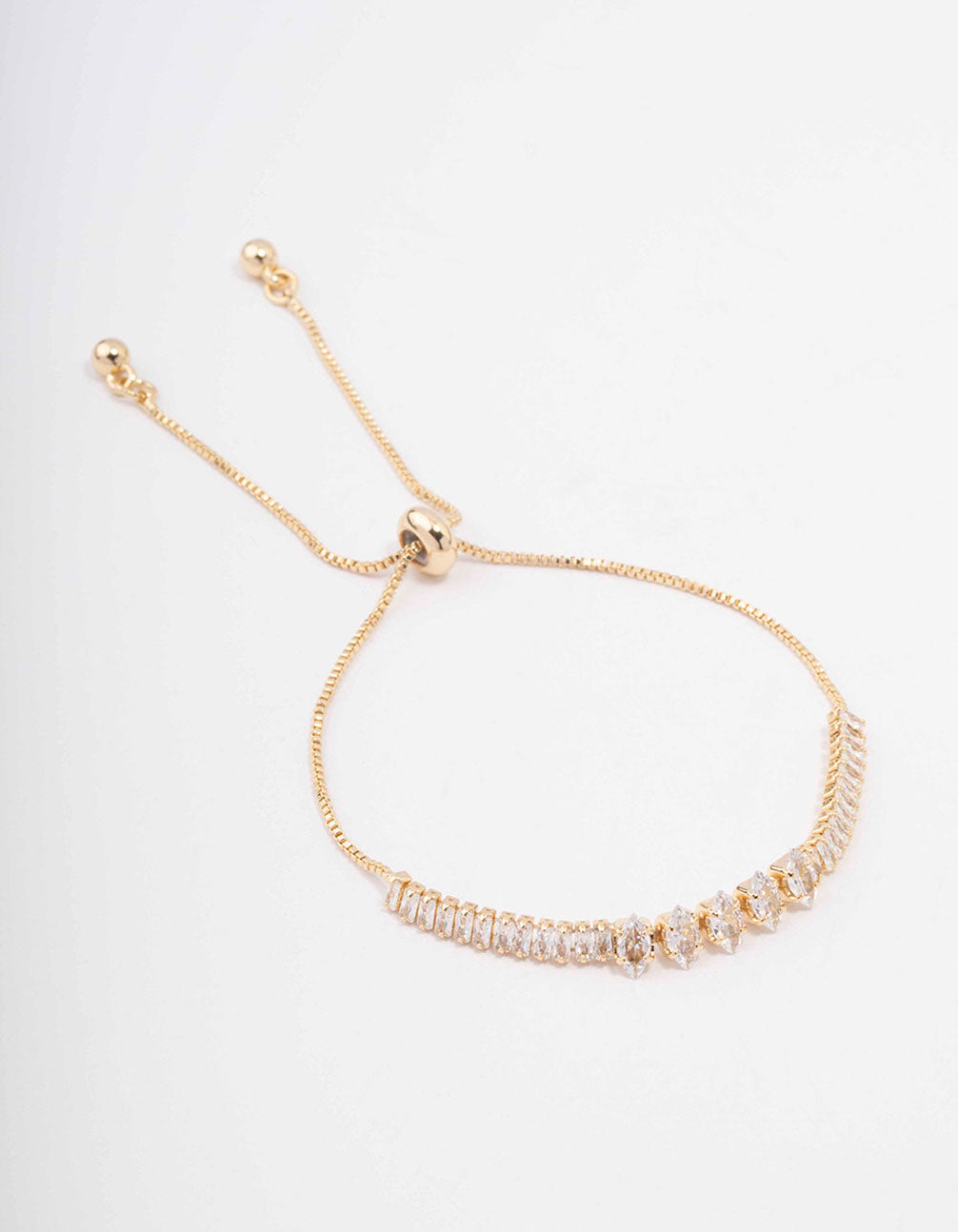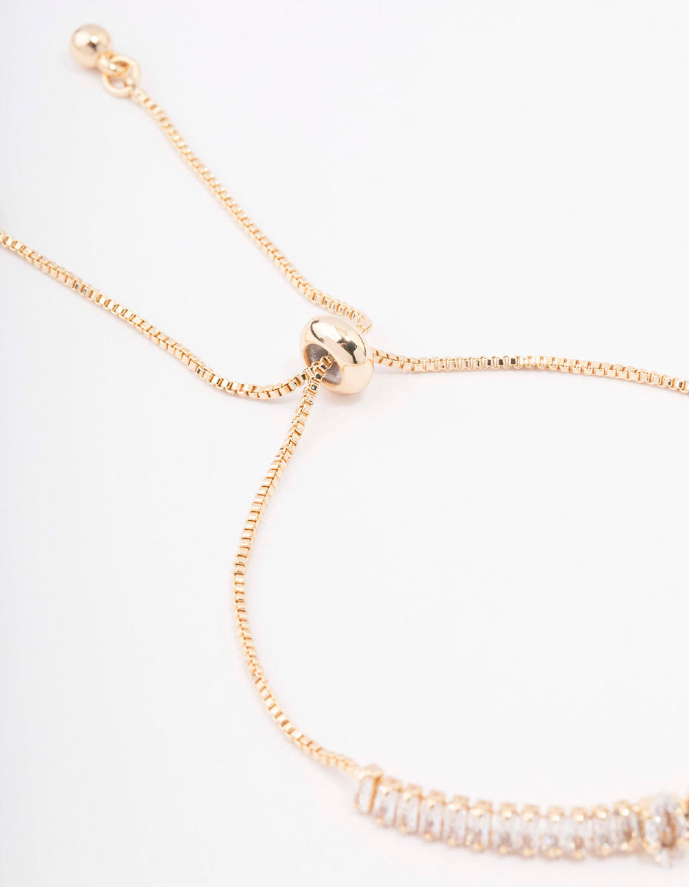This dainty chain bracelet is plated with gold with a brass baseand features a collection of baguette-cut crystals for a luxe finish to your stack.