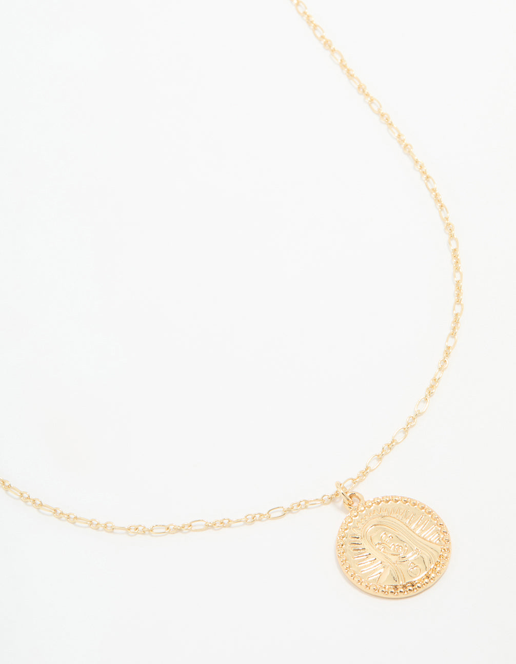 Add a touch of timeless charm to your look with this Gold Plated Mary Coin Pendant Necklace. Featuring a beautifully detailed coin-shaped pendant, this gold-plated necklace is the perfect statement piece for any jewellery lover. Whether you're dressing up for a special occasion or adding a bit of shine to your everyday outfit, this pendant necklace is versatile and effortlessly stylish. Layer it with other necklaces for a chic, stacked look, or wear it solo to let the intricate Mary design shine. Ideal for pairing with casual jeans and a tee or elevating a sleek evening dress, this divine accessory is a must-have for any jewellery collection.