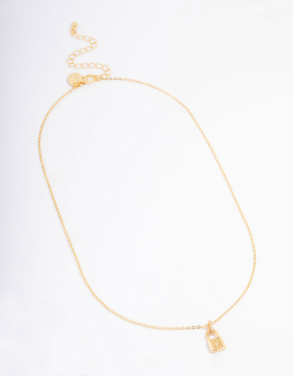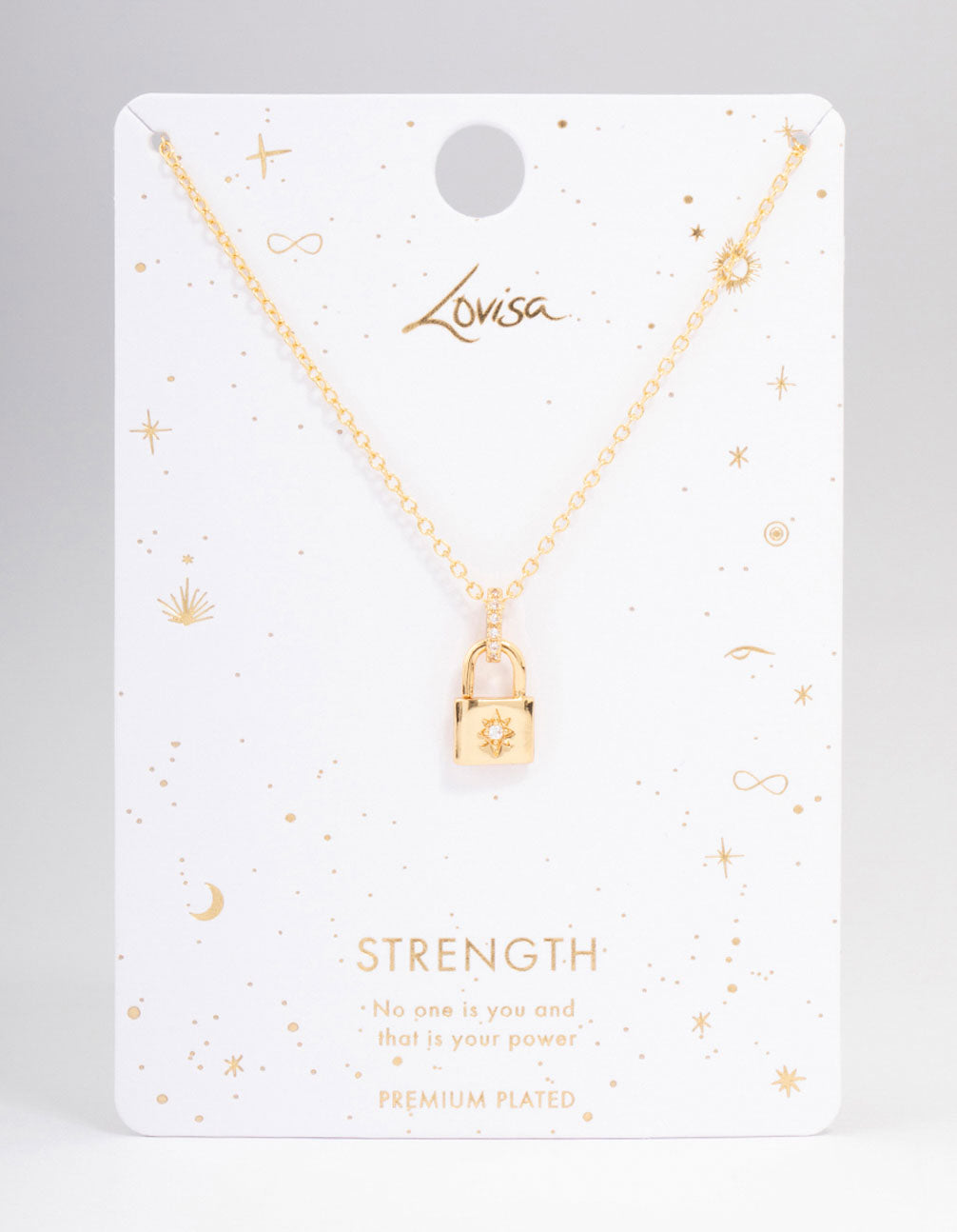 This pendant necklace features a fine gold chain and mini lock charm as a symbol of strength.