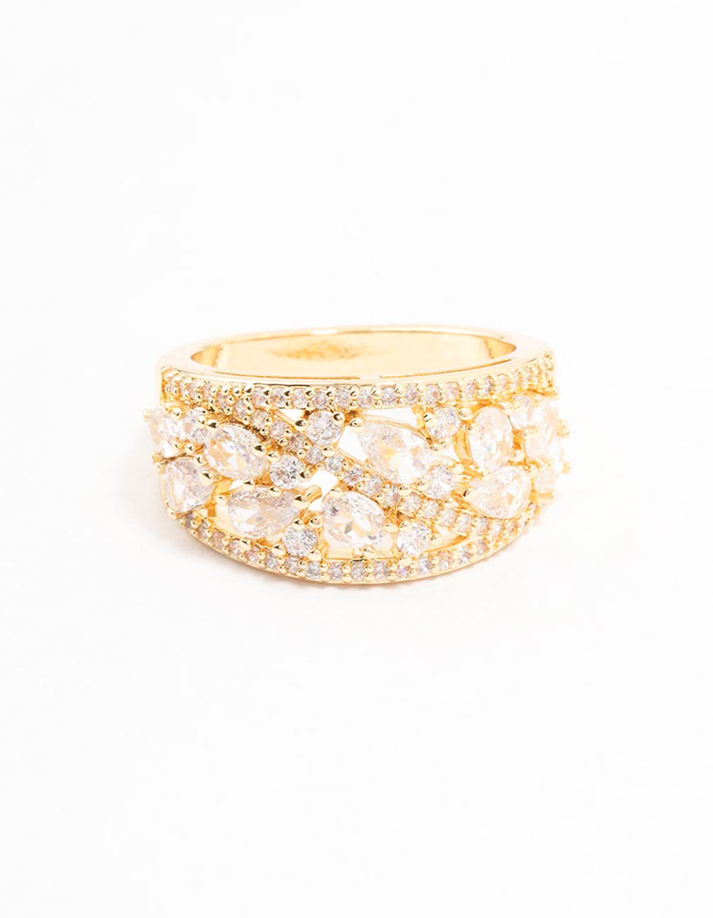 Indulge in glamour with this chic gold-plated ring, adorned with sparkling cubic zirconia stones in a stylish, eye-catching design. Perfect for any occasion, its blend of modern flair and timeless elegance elevates your look effortlessly.