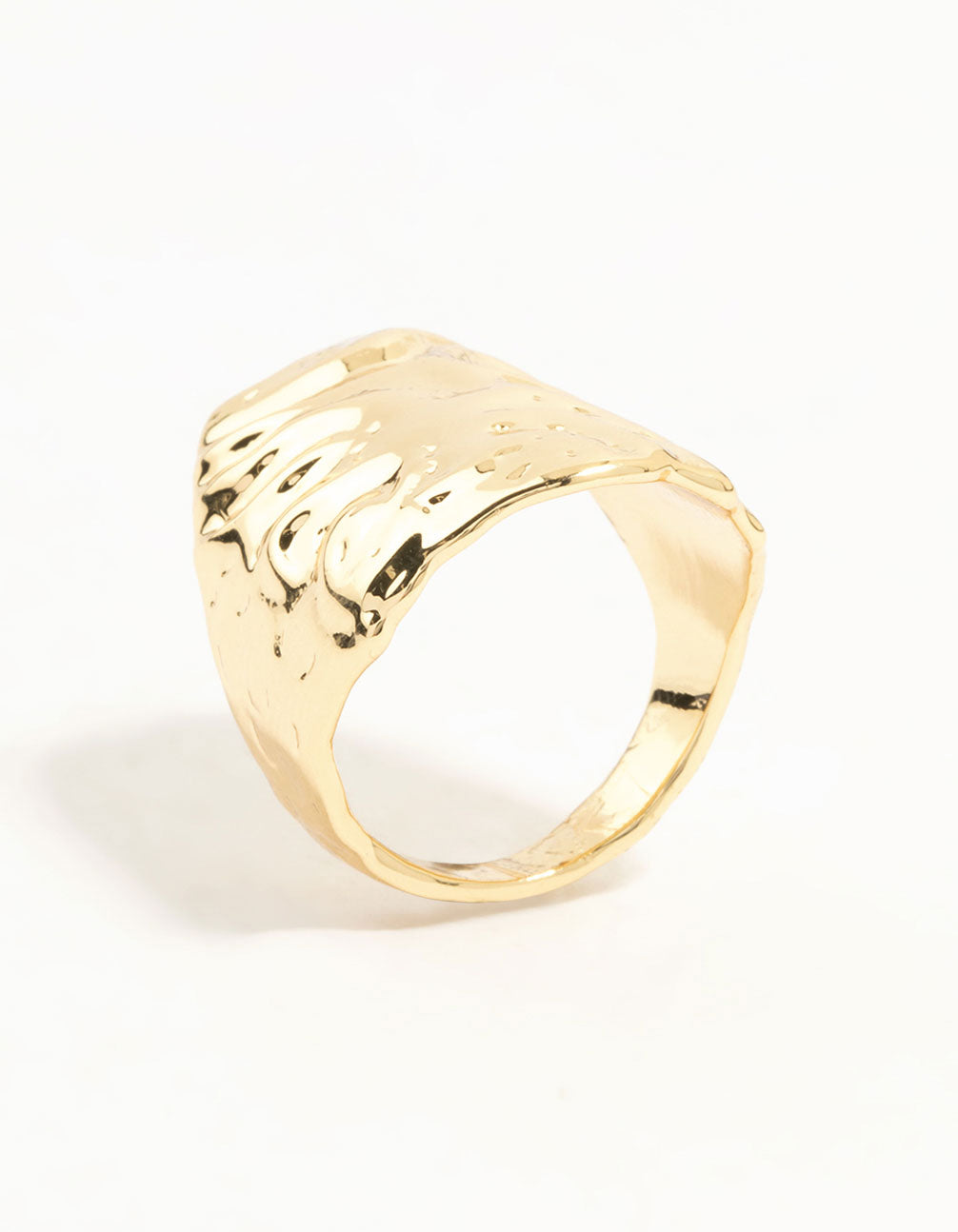 Rock a bold look with this gold-plated ring! Its molten style and shield design make it effortlessly cool and striking.