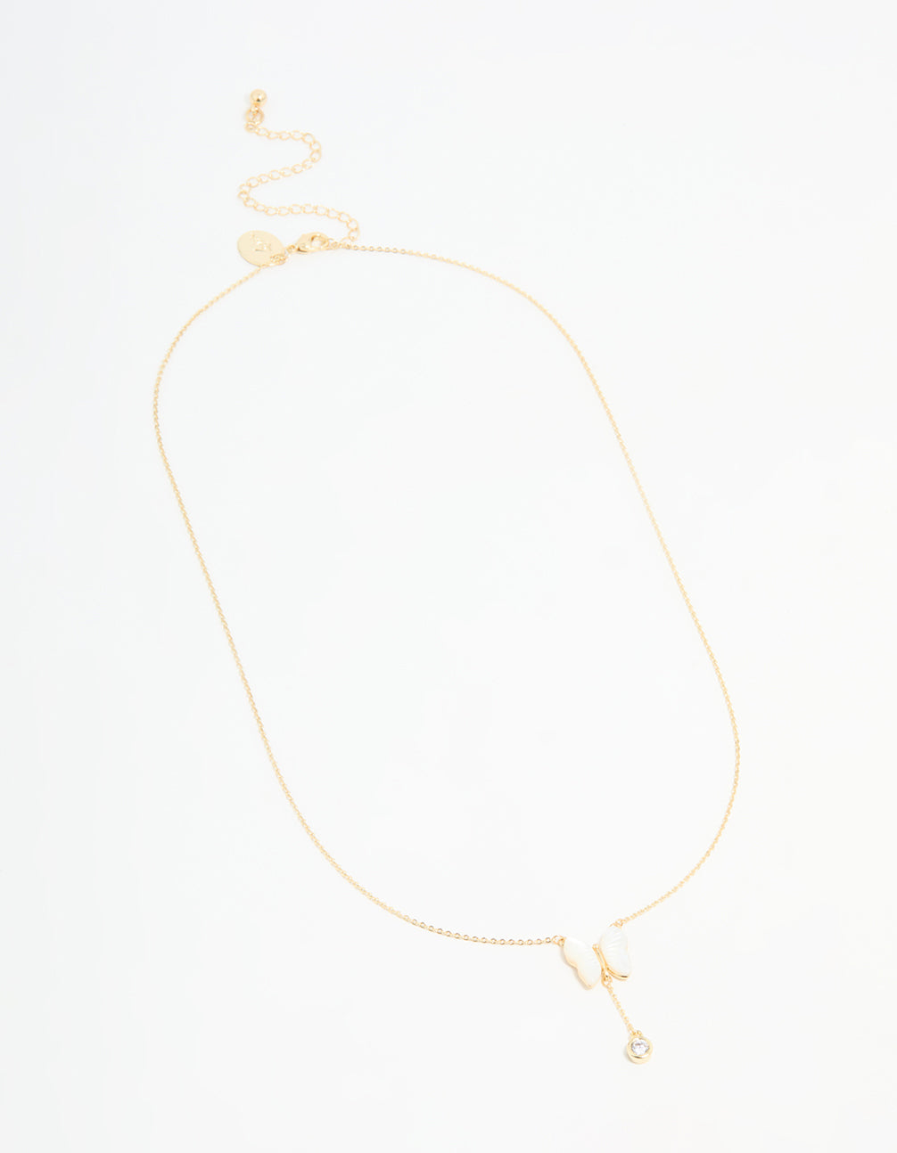 Gold Plated Mother Of Pearl & Cubic Zirconia Butterfly Y-Necklace