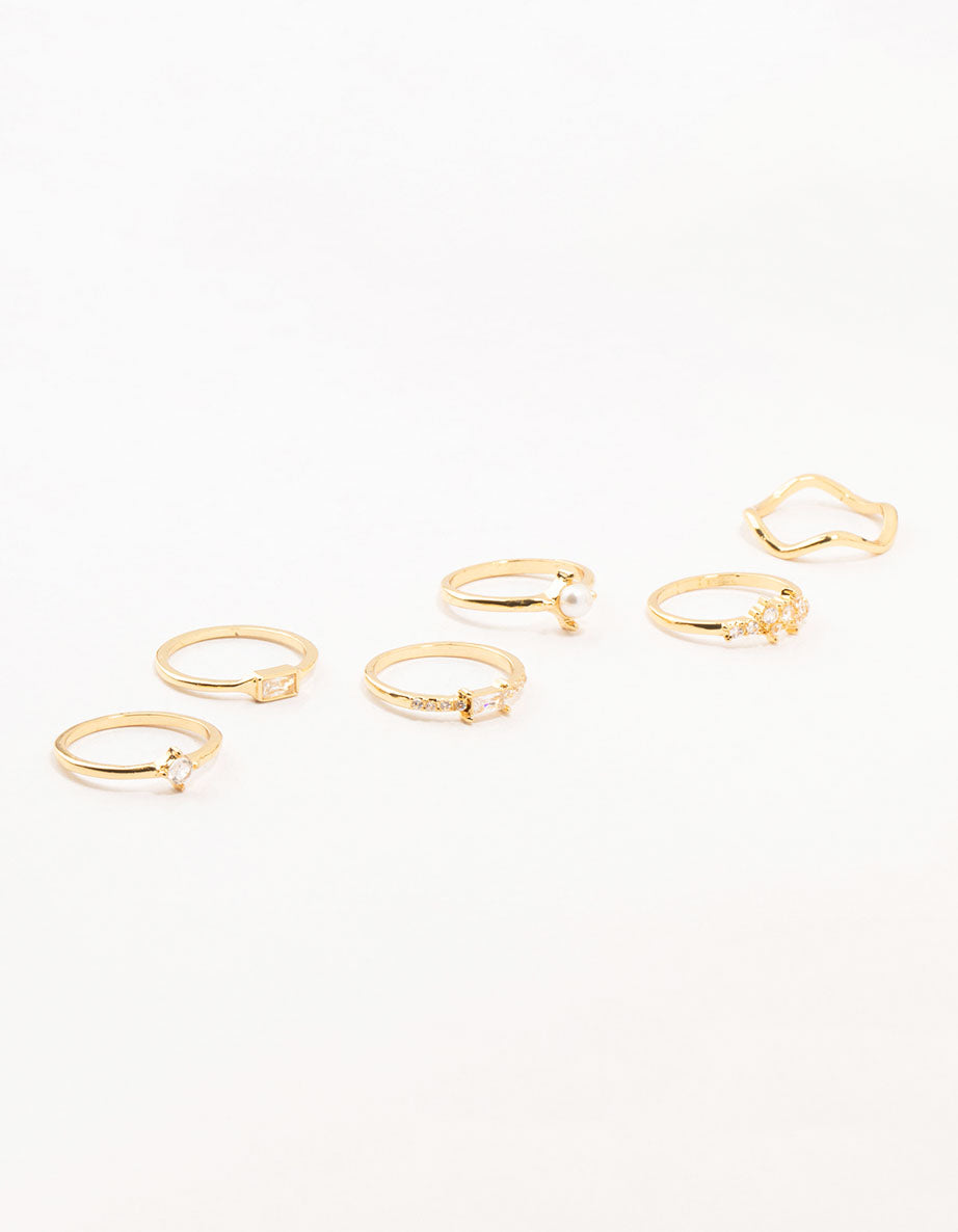 Be spoiled for choice with this pack of six rings. This pack features six styles including pearls and diamante crystals for that truly enchanting touch. Stack them up for a playful look or alone for a minimalistic look.
