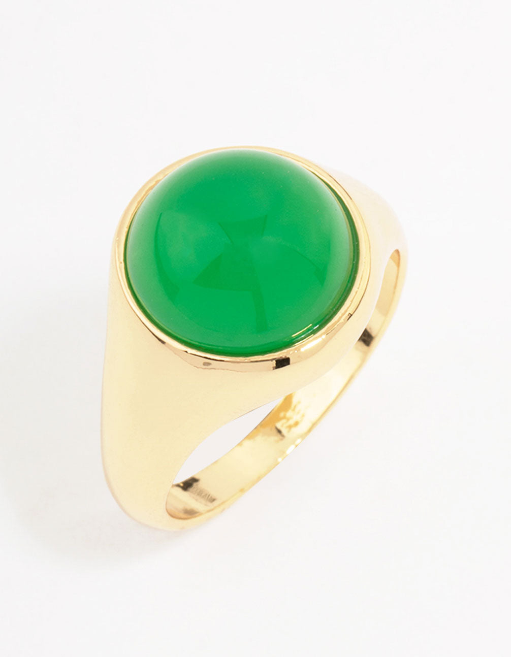 This eye-catching ring features a thick, gold plated band adorned with a round, green statement stone in the centre.